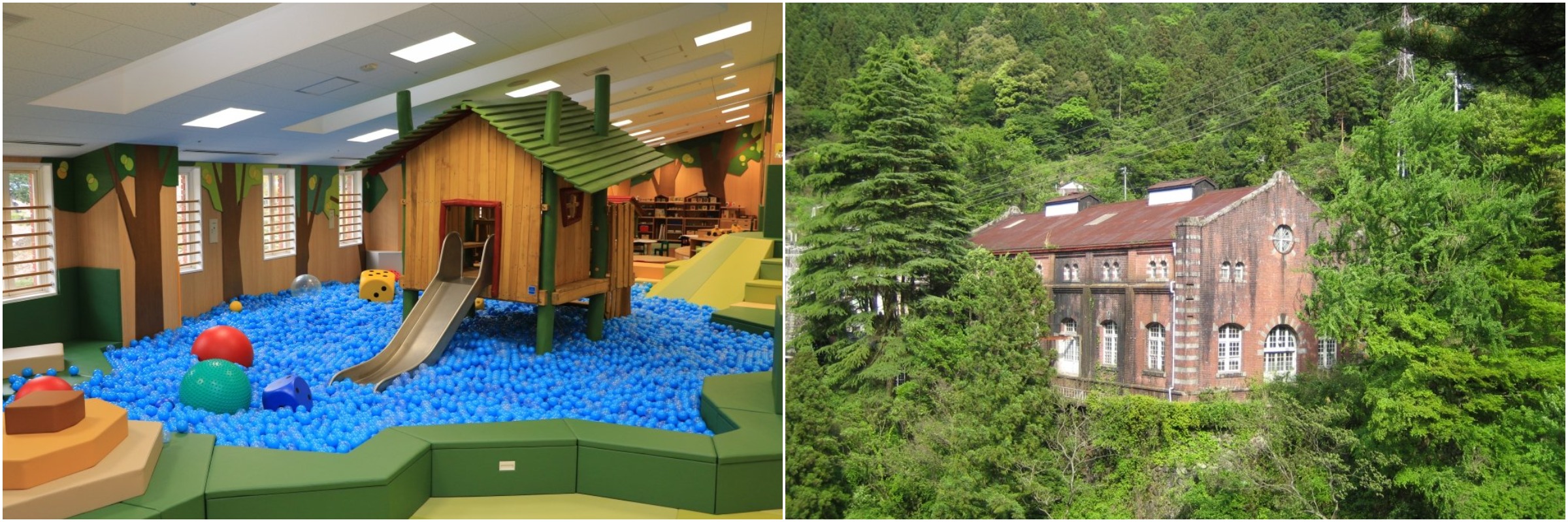 Play facilities for children from 0 to 12 years old (left). On the other side of the river, you can see the old Hantoshi Hydroelectric Power Station (registered tangible cultural property) (right). (Image credit: Visit Ehime)