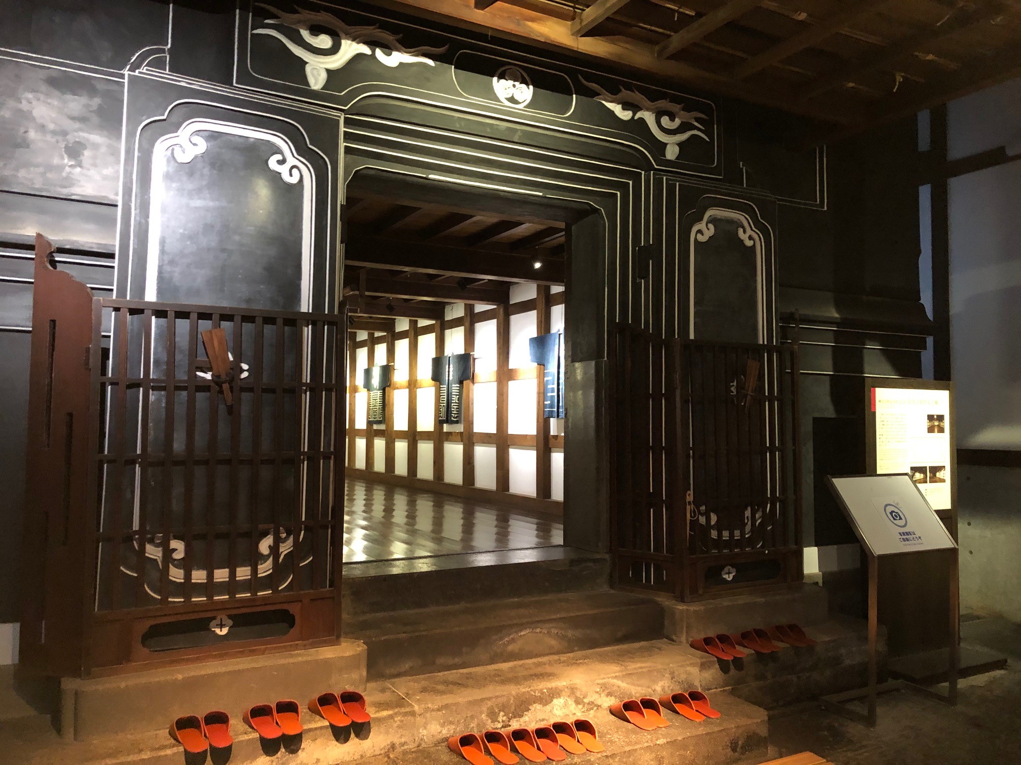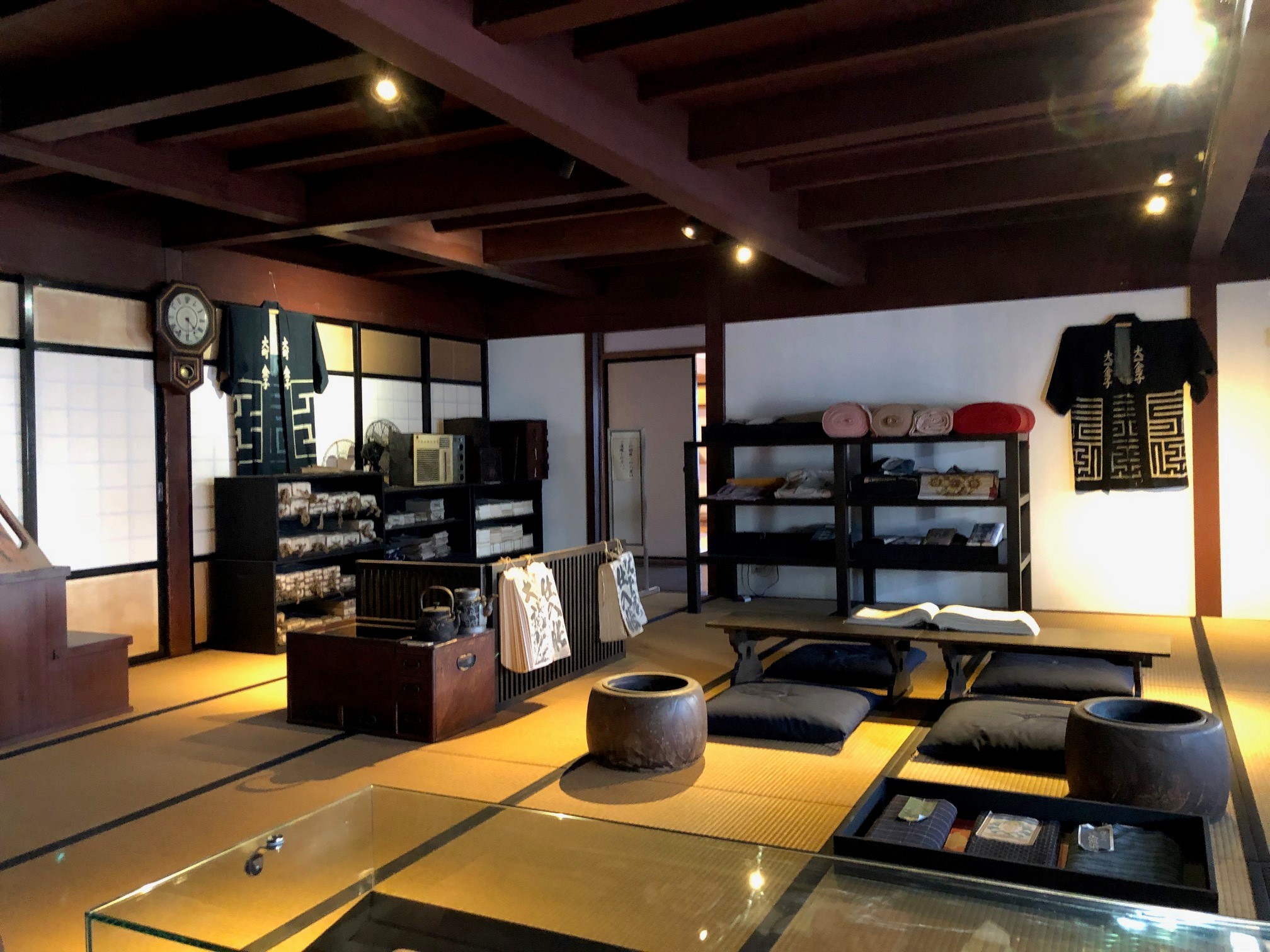 Go further in, and you can see the magnificent old mud-walled storehouse (土蔵 dozо̄). The dozо̄ is flanked by grand black doors, and is currently used as a resting place, with chairs and tables inside. It can also be rented as a venue to hold small lectures and meetings.