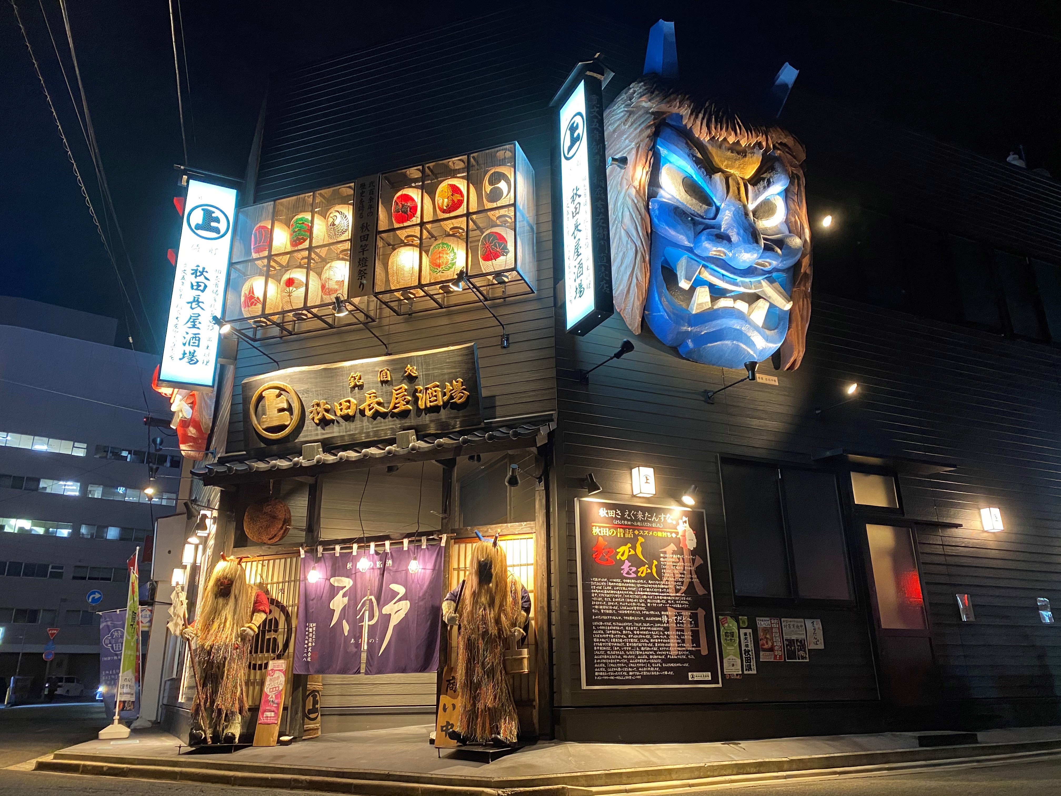 After a day of exploring the city, you might be feeling tired, so let’s end the day with a feast at Akita Nagaya Sakaba (秋田長屋酒場), where you can enjoy Akita’s local cuisine together with special guests—namahage. Namahage are visiting deities (来訪神 raihо̄shin) originating from Akita’s Oga Peninsula, and are a UNESCO Intangible Cultural Heritage. Even before entering the restaurant, you can see large namahage decorating the exterior.