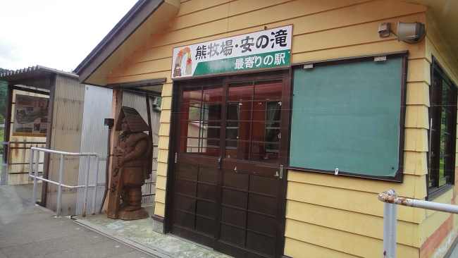 Ani-Matagi Station, the station closest to Kuma-Kuma-En and Matagi-no-yu. The statue next to the station building is that of a matagi. (Image credit: Kevin Koh)