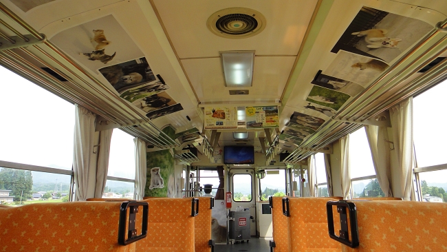 The interior of an Akita Nairiku Line train, with Akita-inu images plastered all over the ceiling. (Image credit: Kevin Koh)