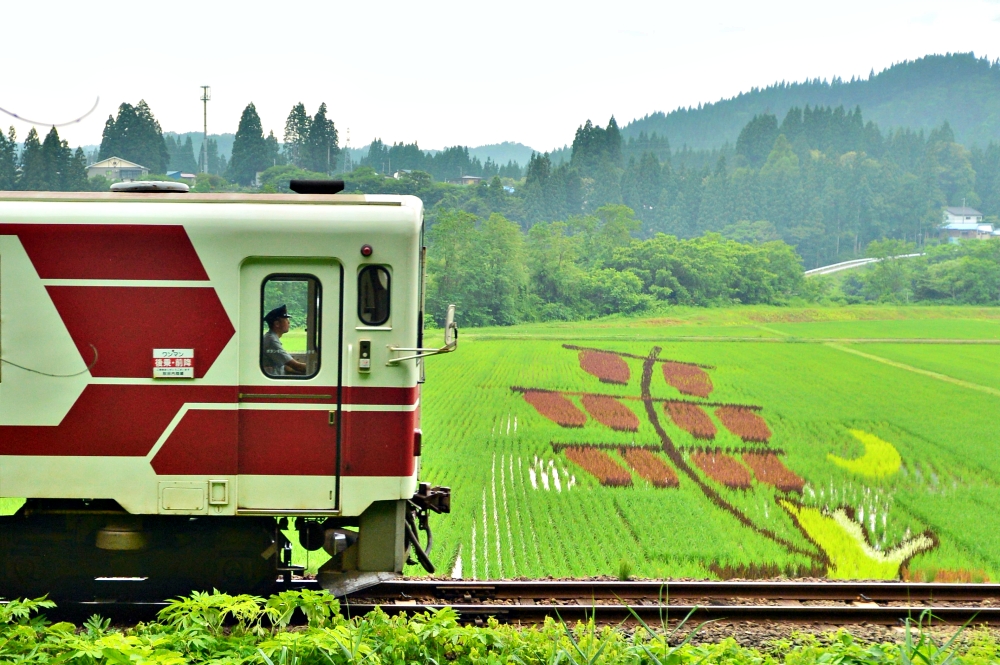 For the noritetsu train fans who like to look at the scenery from within the train, though, there are also views for you to enjoy along your ride on the Akita Nairiku Line without having to get off the train! Some of you may have heard of tanbo art (田んぼアート). For the uninitiated, tanbo art is where rice fields are used like canvasses and rice plants of different colours are planted in a specific design in order to create a huge image best viewed from afar.