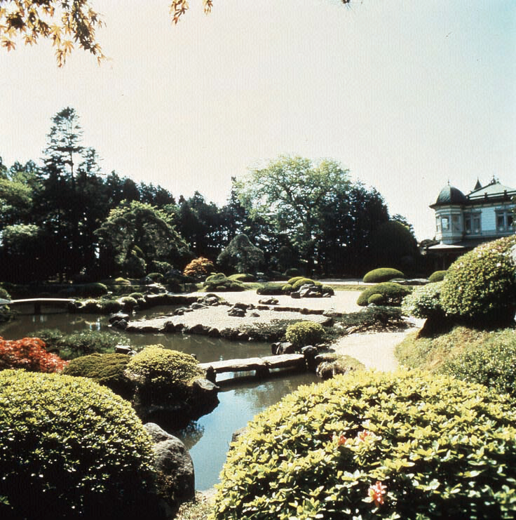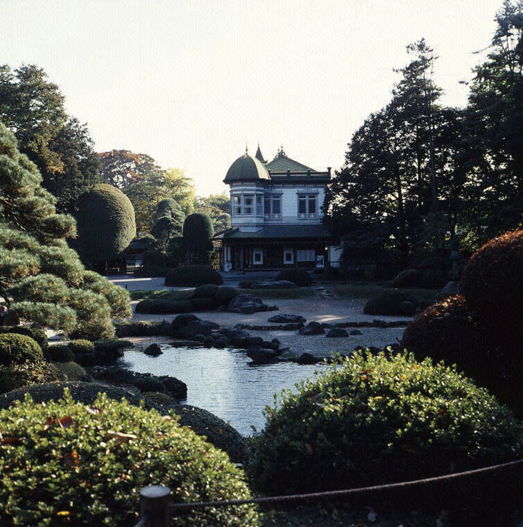 The most outstanding feature of the entire compound is Seibikan (盛美館), a Western-styled mansion that stands in contrast to the Japanese garden. Seibikan was built in 1909 and designed according to Giyofu (擬洋風建築 Giyōfū-kenchiku), which is "Japanese pseudo-Western architecture" that resembles Western-style construction but actually relies on Japanese techniques. This mansion drew inspiration from Japanese and Western architecture that was predominant during the Meiji Period (明治時代 Meiji-jidai).