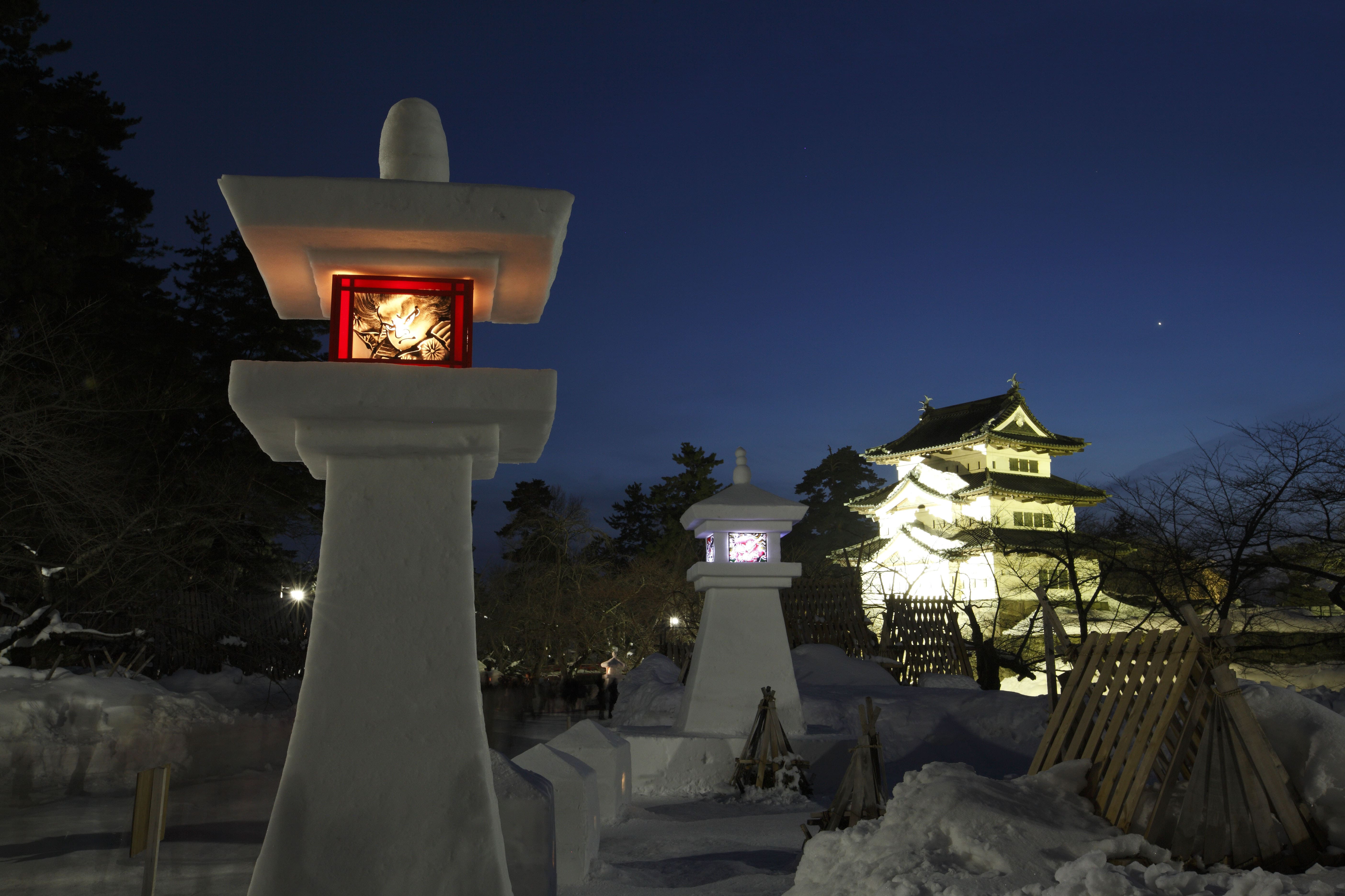 Hirosaki Castle Snow Lantern Festival: the festival takes place over a period of 5 days in February every year. The shops and stalls at the festivals are open usually from 9am to 9pm, with night illuminations and projection mapping starting from 4:30pm onwards. Entry is free for visitors.