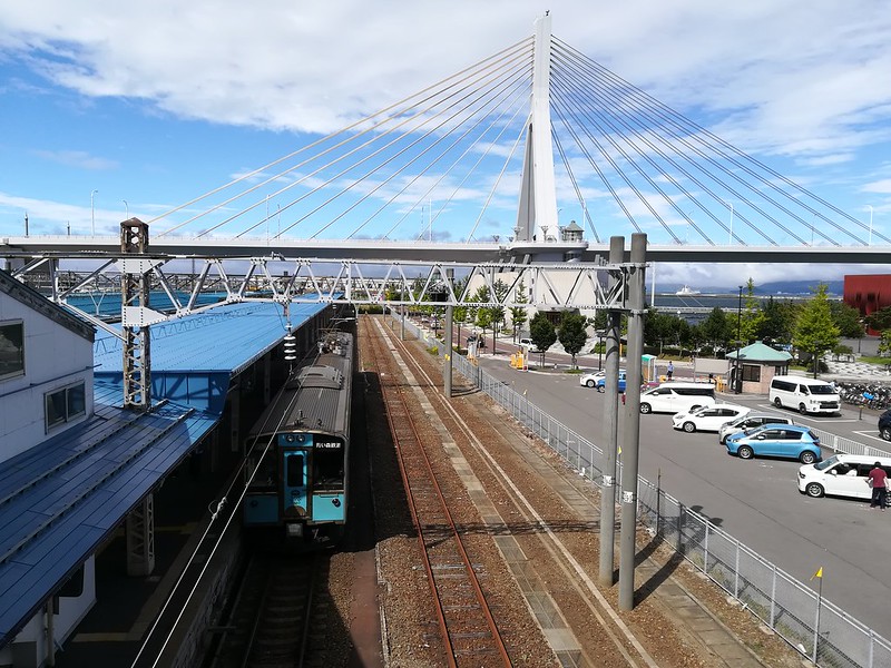 Aomori Bay Bridge: the bridge is located in Aomori city, and is open to public. Visitors can take the JR Ōu Main Line from JR Shin-Aomori Station to JR Aomori Station (JR青森駅 Aomori-eki). The train journey takes only 6 minutes, and the fare is ¥190 per adult.