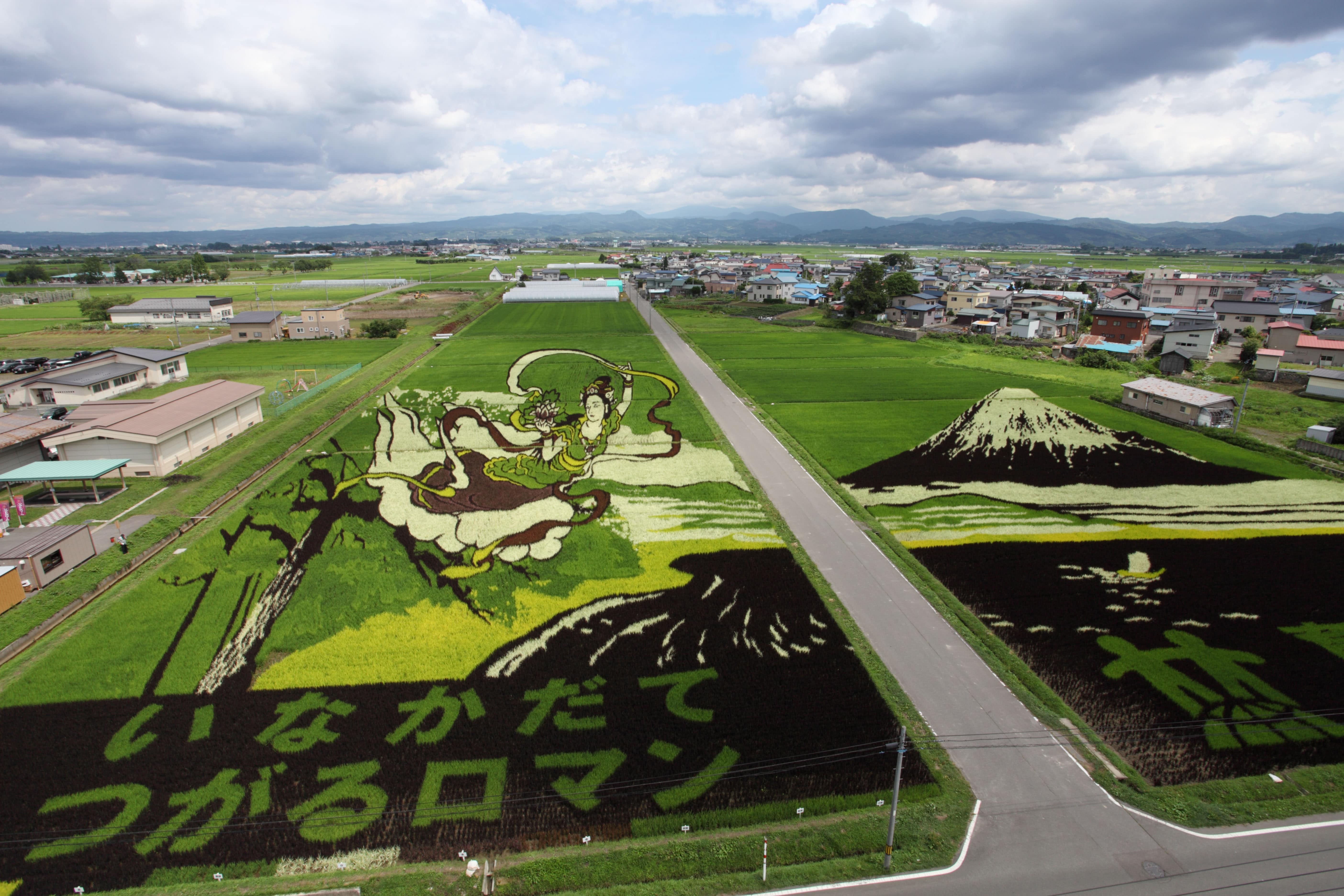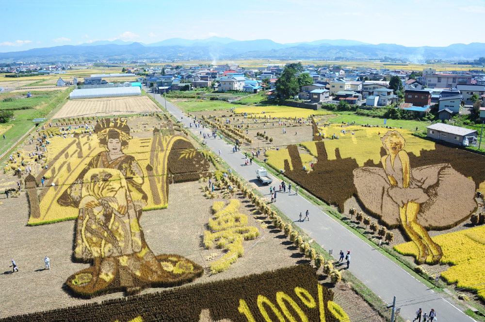 The peaceful village of Inakadate (田舎館村 Inakadate-mura), with a population of less than 10,000, is home to amazing paddy field art (田んぼアート tanbo-āto), a distinctively Japanese art form where people plant rice of various types and colours to create images in a paddy field.