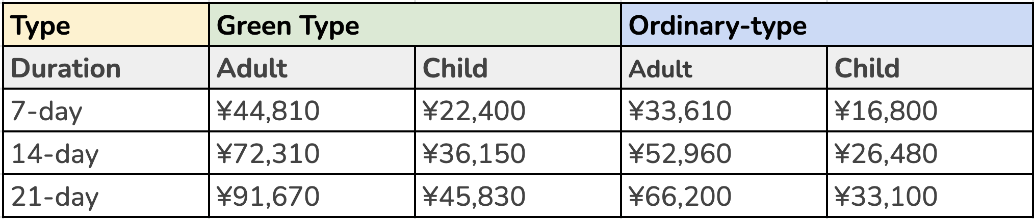 *Prices shown are accurate as of April 2020 and are subject to change. Prices will also differ at JR-designated sales offices and agents overseas.