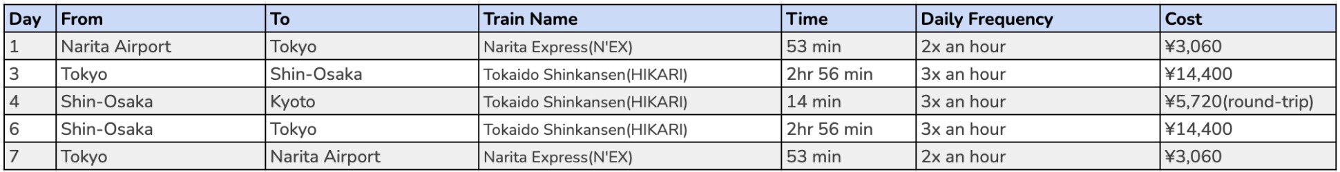 Let’s assume a 7-day holiday where you plan on spending three days in Tokyo, three days in Osaka and a one-day trip to Kyoto. Flying in and out of Narita International Airport in Chiba, the minimum cost of necessary travel for this trip would look as follows: