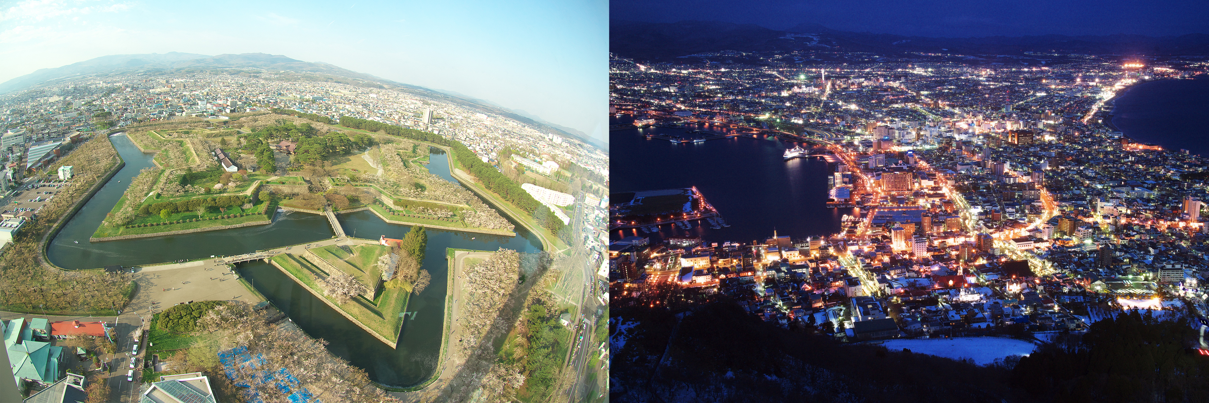 The view Fort Goryokaku from the observation tower and the night view of Hakodate City from Mount Hakodate. (Image credit: photoAC)