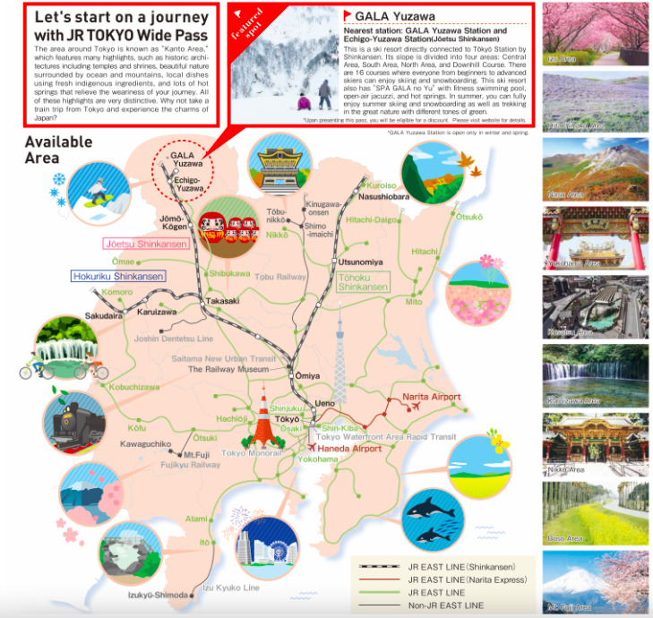 Perhaps one of the best uses of the JR TOKYO Wide Pass is the easy access to the GALA YUZAWA SNOW RESORT in Niigata Prefecture (新潟県 Niigata-ken)! As the only ski resort in Japan with its own dedicated shinkansen station, GALA YUZAWA SNOW RESORT is easily the most accessible spot from Tokyo to get your ski and snow fix, being only 75 minutes north of the city by the Joetsu Shinkansen Line. You don’t even need to bring your own ski gear or even be an expert in skiing to visit—the resort has plenty of equipment available for rental, as well as a variety of ski and snowboard lessons available in English, Mandarin, and Thai for beginners to learn the ropes!