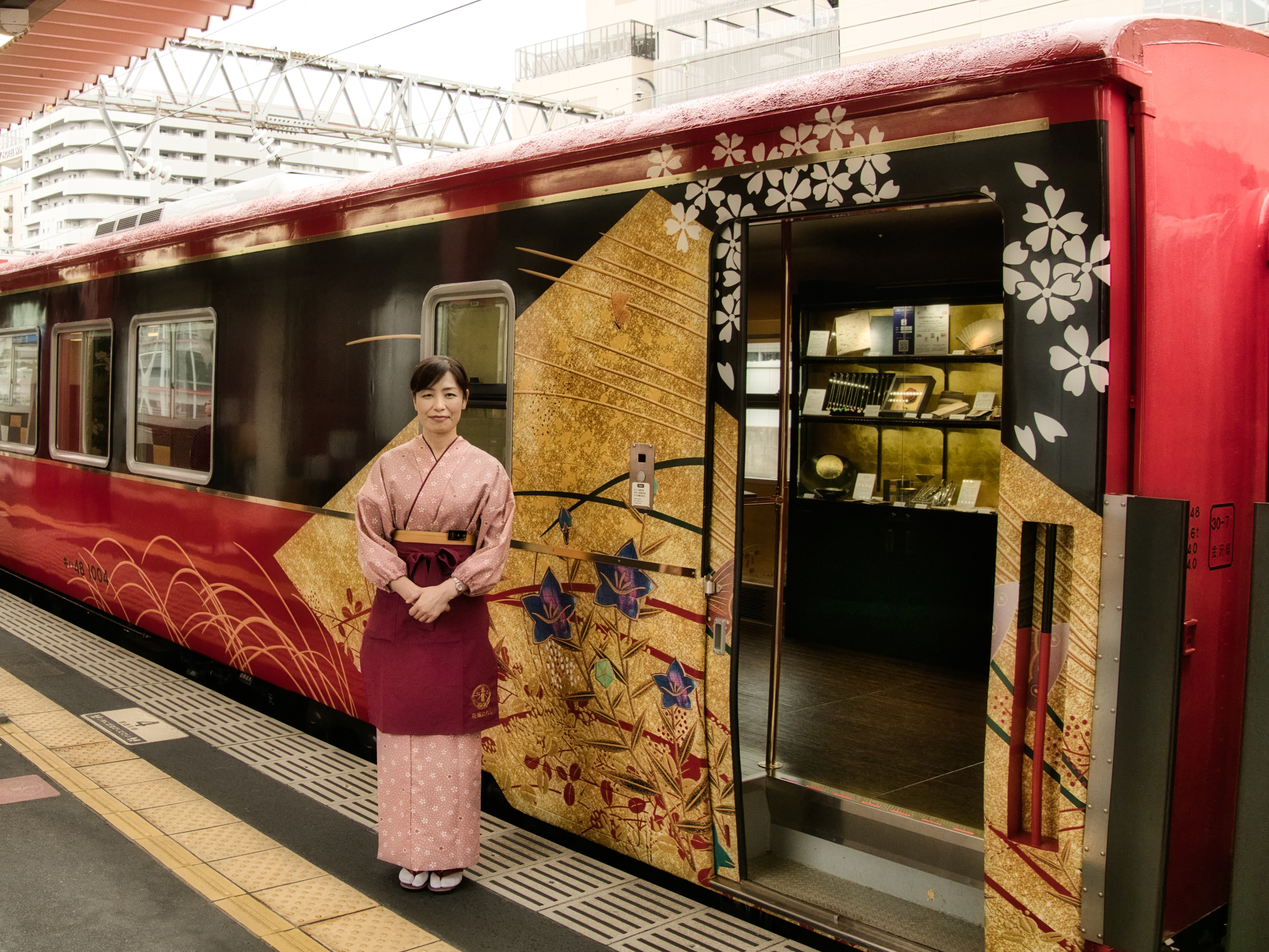 Besides the usual limited express trains, the route between Wakura Onsen and Kanazawa is also served by its very own specialty train, the Hanayome Noren (花嫁のれん)! Decked from front to end in beautiful designs inspired by Wajima lacquerware, gold leaf and other traditional crafts, this magnificent crimson and gold train truly embodies the spirit of Kanazawa City. The interior of the first cabin consists of eight unique semi-private compartments which will make you feel like you’re in a ryokan rather than on a train.
