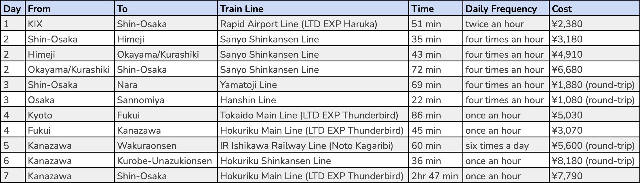- Kansai-Hokuriku Area Pass (7 Days) price: ¥15,270