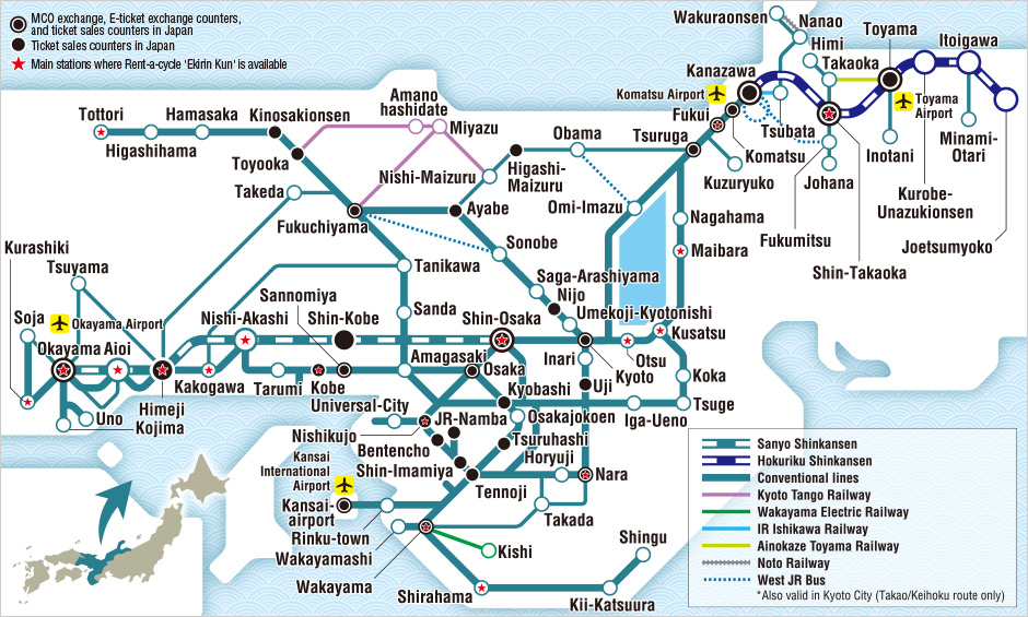 The Kansai-Hokuriku Area Pass is available for purchase online and at selected overseas travel counters, including the JTB Rail Pass Counter available at JAPAN RAIL CAFE.