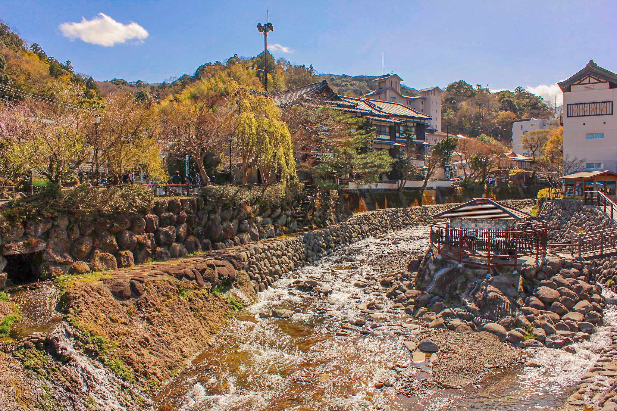 While Kanzanji Onsen was a more modern, ocean-facing hot spring resort town, Shuzenji Onsen is an older, far more traditional-looking town with over a thousand years of history and plenty of ryokan (旅館 traditional Japanese inn). This beautiful locale has everything you could ask for in a quintessential onsen town experience, from bamboo forests, gushing hot-water streams, and beautiful Edo-era architecture. There are also a good number of attractions in the vicinity which would make for good day trips, including Niji no Sato (虹の郷 an England-themed amusement park) and Tokko no Yu (独鈷の湯 the main public open-air bath house).