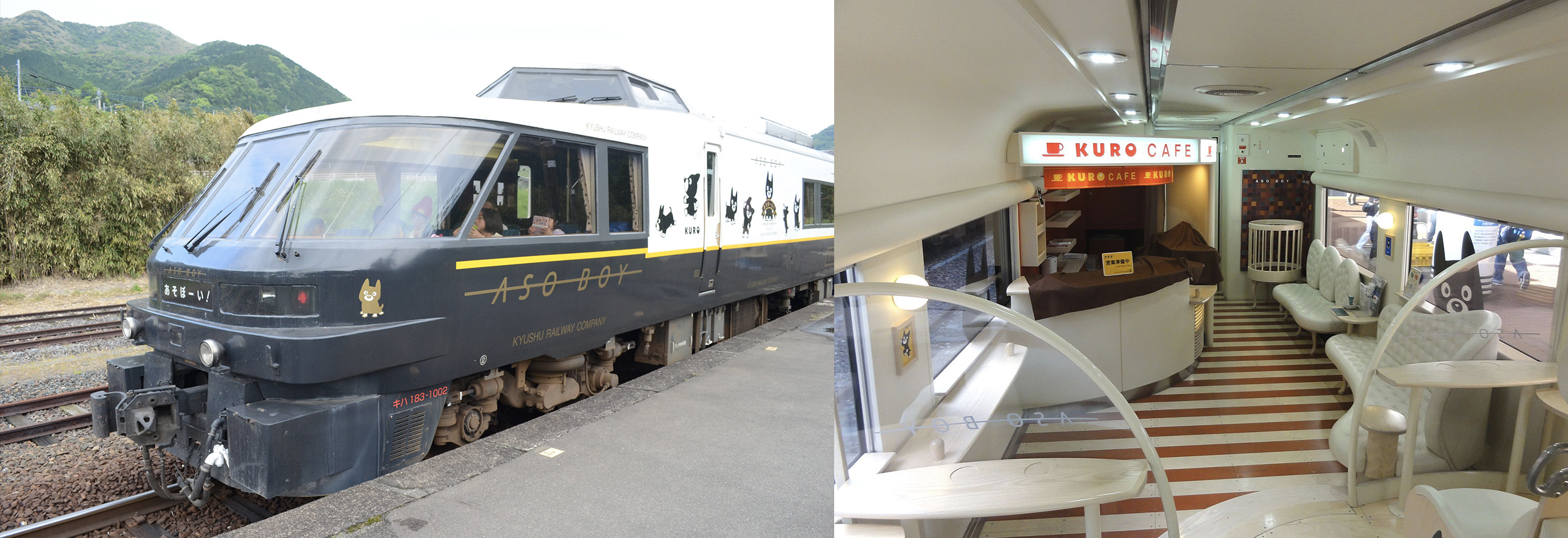 The Aso Boy! is the perfect train for families with young children (or the young at heart), with a bright and sleek interior featuring several child-friendly features, including a playroom, a picture book library, and even a ball pit filled with wooden balls! The train is also dotted with decals and illustrations of its mascot, the affable black dog Kuro, who has its own onboard cafe where you can buy Kuro merchandise and meals.