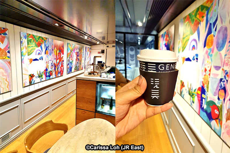 The second half of Car 13 is the gallery café. Here you can purchase Tsubame coffee (drip coffee from Niigata’s Tsubame region) served in limited edition GENBI SHINKANSEN cups. There are also some desserts made with local Niigata ingredients for sale, like cake made with rice flour from Uonuma and butter from Sado Island. The floor and furniture are wooden, and kaleidoscopic abstract paintings by Kentaro Kobuke graces the walls.