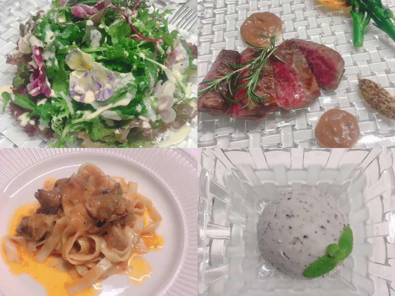 Finally, it was time for dinner. As an appetiser, we had a salad featuring edible flowers. It was very gorgeous in appearance. The main dish, Shinshu beef, which was cooked at a low temperature, was very tender, and the Japanese-style Maitake mushroom sauce matched the meat. We enjoyed all the dishes—appetisers, bread, pasta, and main meat—while enjoying the conversation.
