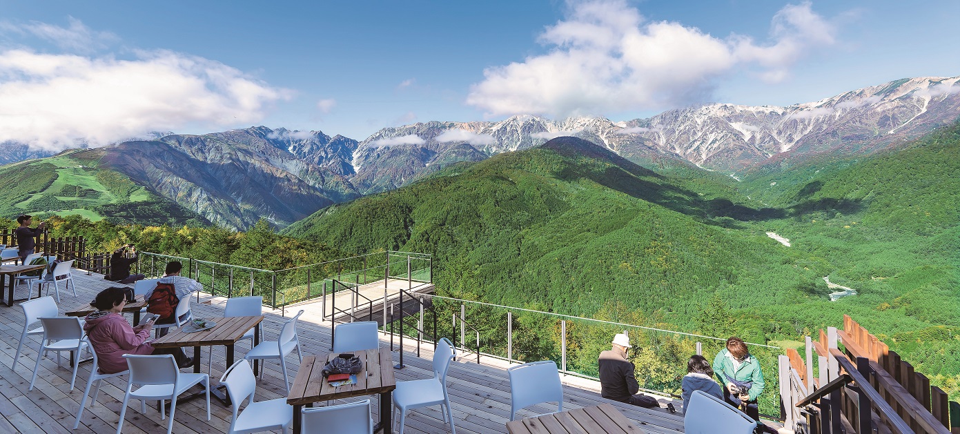 However, the most amazing scenery awaits you on the other side of the bakery, where there is a viewing terrace known as the HAKUBA MOUNTAIN HARBOR. At an elevation of 1,289m, the terrace offers unobstructed, panoramic views of the Northern Alps and Hakuba’s impressive mountains.