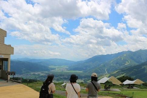 Our first stop for the day was Hakuba Iwatake Mountain Resort. From Hakuba Station, we took a shuttlebus to the foot of Mount Iwatake, then took the Noah gondola up to Hakuba Iwatake Mountain Resort. After getting off the gondola, the Northern Alps, which still had a little snow remaining on its peaks, appeared in front of us, and we were overwhelmed by the magnificence of nature.