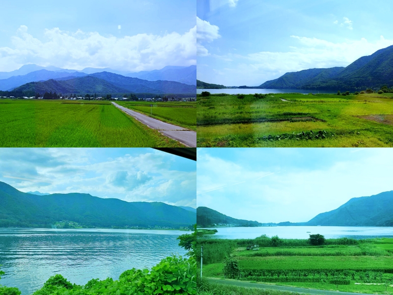 From the train windows, you can see the Three Lakes of Nishina (仁科三湖 Nishina sanko)—Lake Kisaki (木崎湖 Kisaki-ko), Lake Aoki (青木湖 Aoki-ko), and Lake Nakatsuna (中綱湖 Nakatsuna-ko)—and the magnificent mountains of the Northern Alps (北アルプス Kita-arupusu).
