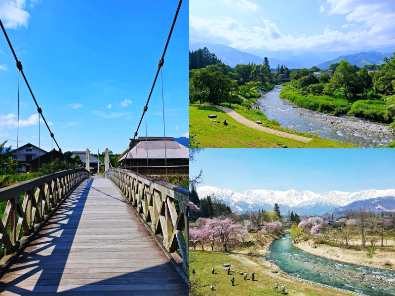 The park’s scenery is particularly mesmerising in spring, when you can see cherry blossoms against a background of snow-capped mountains, with the Hime River (姫川 Himegawa) flowing in the foreground. Also at Oide Park is the Oide Suspension Bridge (大出吊り橋 О̄ide Tsuribashi), a wooden suspension bridge and one of the highlights of the park.