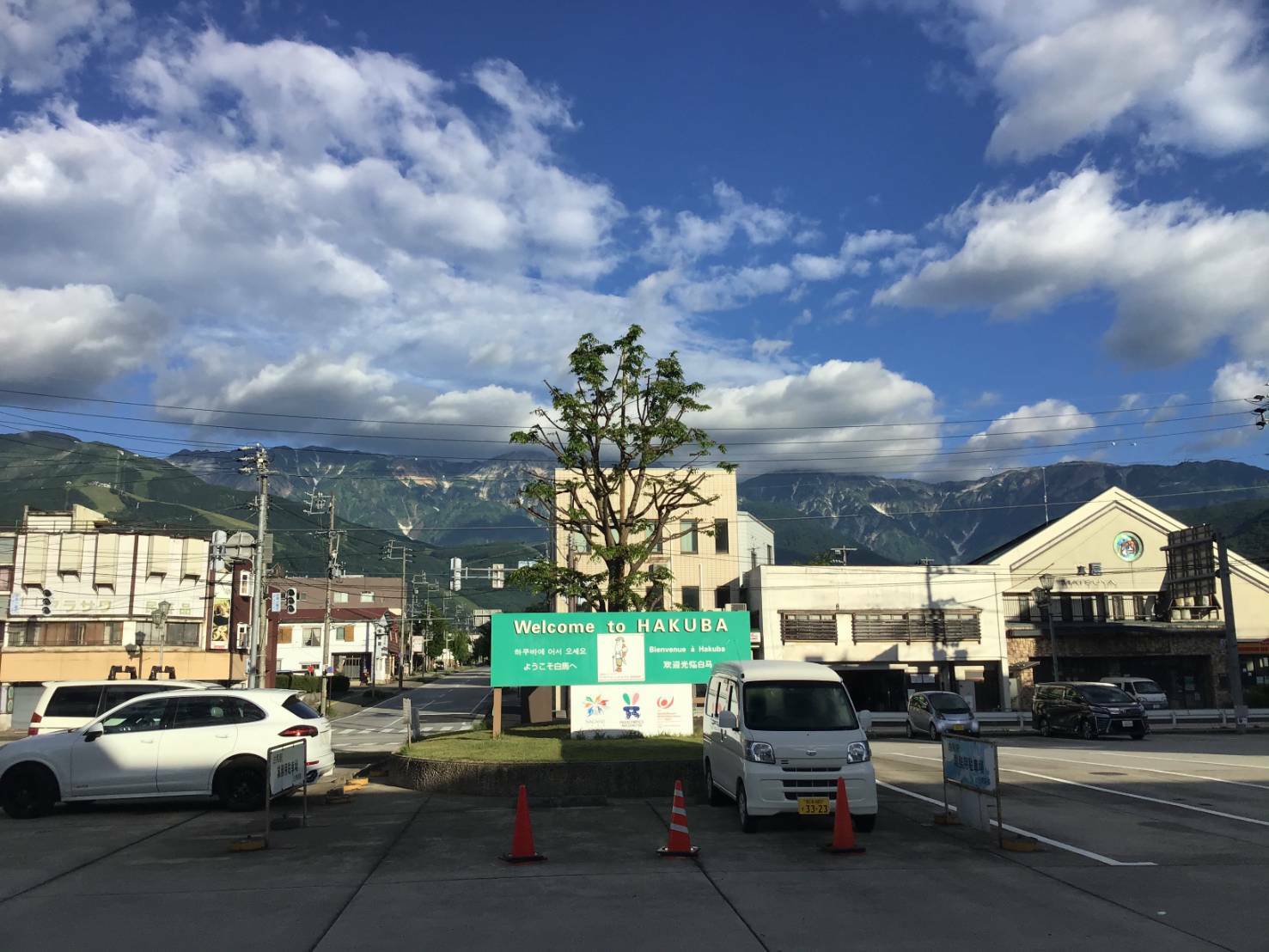 After exiting the ticket gate, the sight of Hakuba's tall mountains welcomed us. Whenever we get off at Hakuba Station, we are always deeply impressed by its proximity to the high mountains.