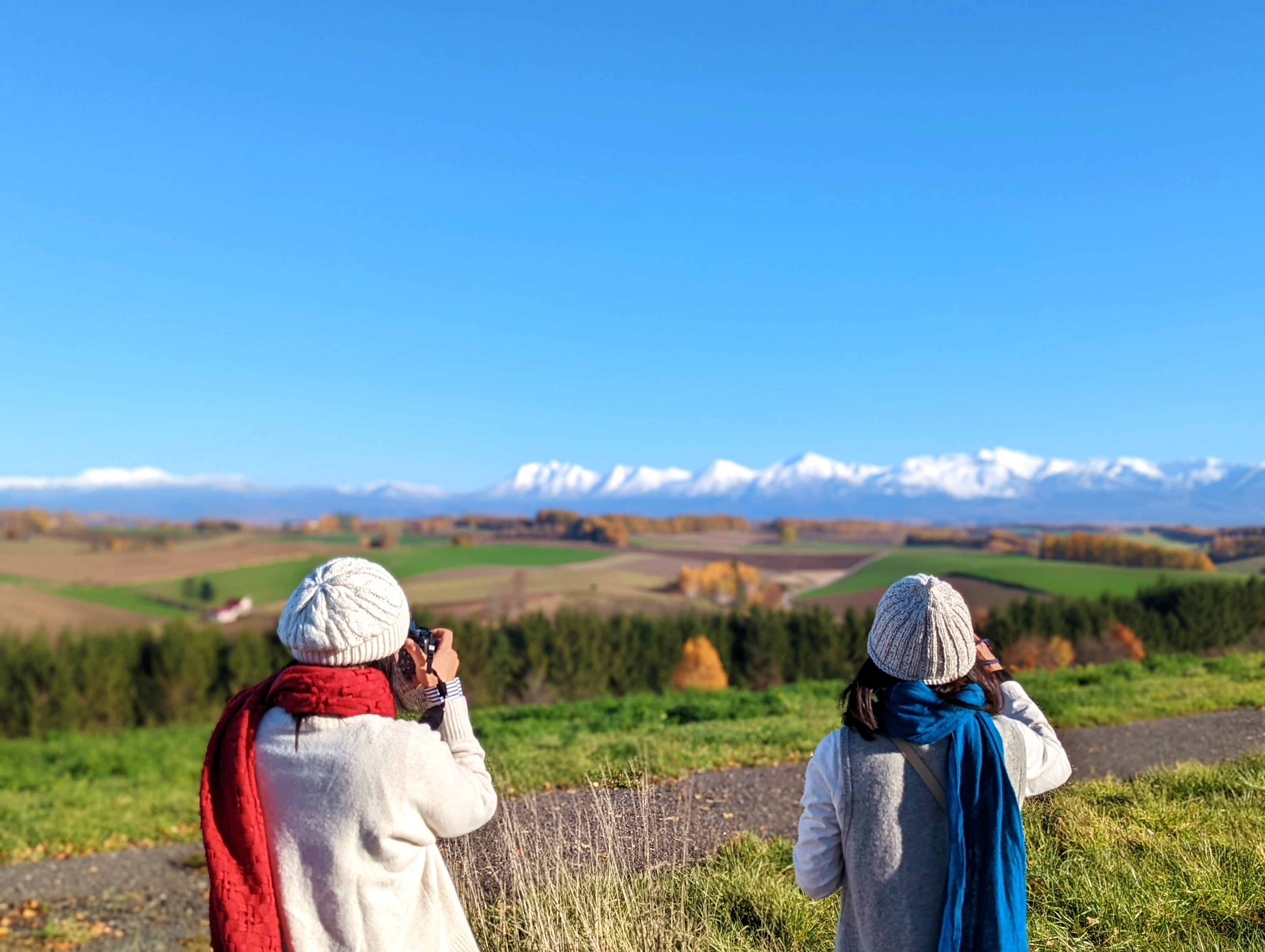 The snow caps of the Tokachidake (十勝岳) mountain range can also be seen in the far distance, and the contrast of the white snow with the clear blue sky is breathtakingly beautiful. The landscape of undulating hills and gold-coloured Japanese larches spreads wide open, and you can't stop snapping photos of the endlessly picturesque scenery, which looks like a painting from every angle. The best time to see the autumn colours of Biei is from mid-October to early November.