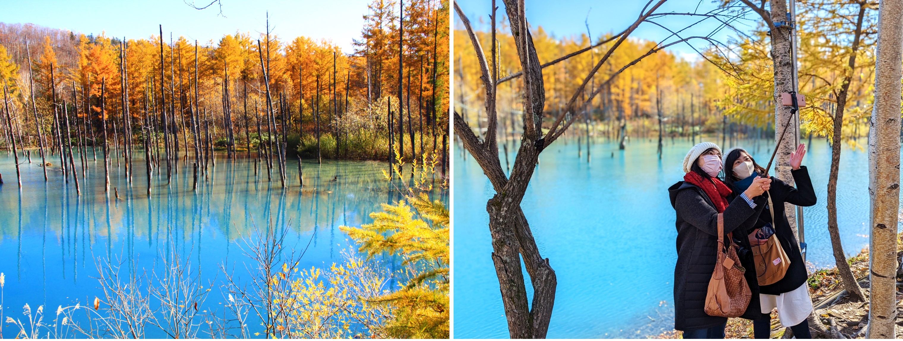 The first must-see spot for autumn leaves in Biei is the Blue Pond (青い池 Aoi-ike). The water in the pond is always turquoise, but only during the autumn season, the water will be surrounded by golden foliage.