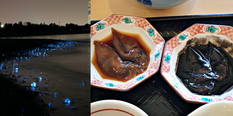 Firefly squid lighting up the sea (left) and firefly squid for breakfast (right). (Image credit: とやま観光推進機構 (left) and JR East / Carissa Loh (right))