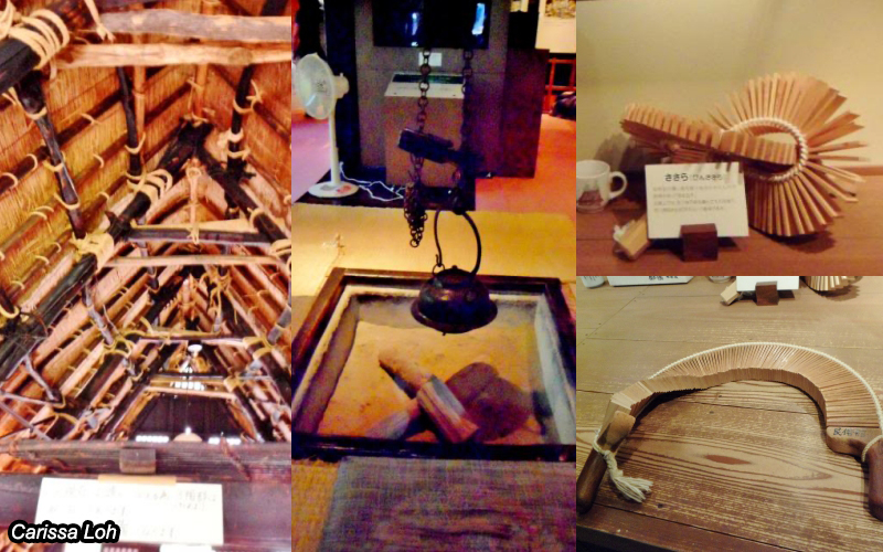 There are a couple of houses which have been turned into museums, and provide an insight into rural life centuries ago. The museums play videos of traditional performances inside, and you can also climb up to the second floor to get a closer look at the inside of the roof. There is also the irori (hearth), which is what people used to eat dinner around. You can also learn a lot about the unique history of the houses and the community, like the local instruments known as sasara and kokiriko (top and bottom right in respectively in the photo above).