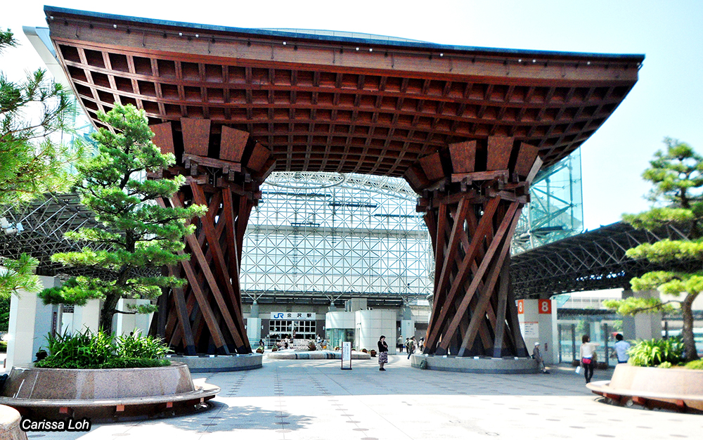 From Toyama, take a 25-minute ride on the Hokuriku Shinkansen to Kanazawa (金沢), the capital of Ishikawa Prefecture. One of the first things you will notice after exiting the station is the impressive and large wooden torii gate outside the station. Kanazawa is a compact city, and most of the main sightseeing spots can be reached with the KANAZAWA LOOP BUS, which offers a 1-day unlimited ride ticket for ¥600 (¥500 for Hokuriku Arch Pass holders).