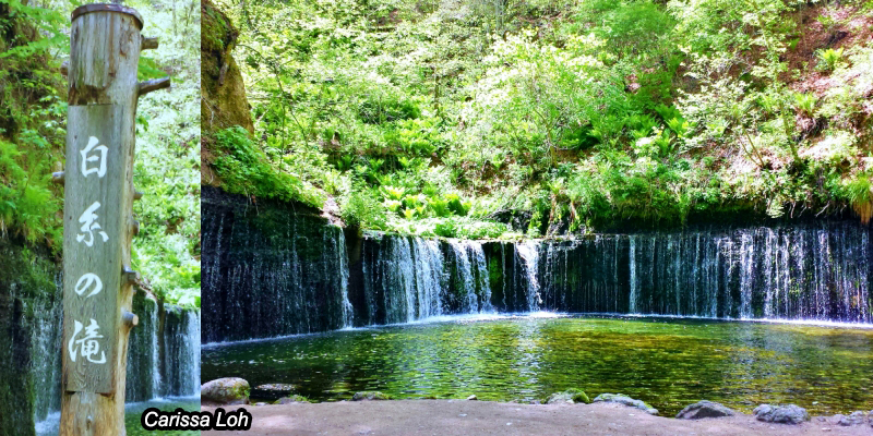 Nature lovers can take a 30-minute bus ride to one of Karuizawa’s highlights, the Shiraito Waterfall (白糸の滝 Shiraito-no-taki). Shiraito means “white threads” and the water flowing down does indeed resemble dozens of white threads cascading down.
