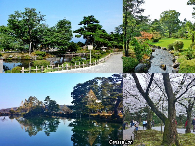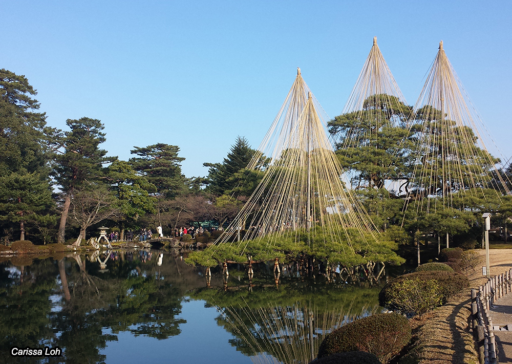 Kanazawa is located in the north coast, cherry blossom season is later (around early to mid-April), and during winter there is high snowfall. If you come during winter, you will see these structures built around the pine trees, known as yukitsuri (雪吊り). They protect the trees by diverting snowfall, so that the heavy snow will not crush and damage the delicate trees.