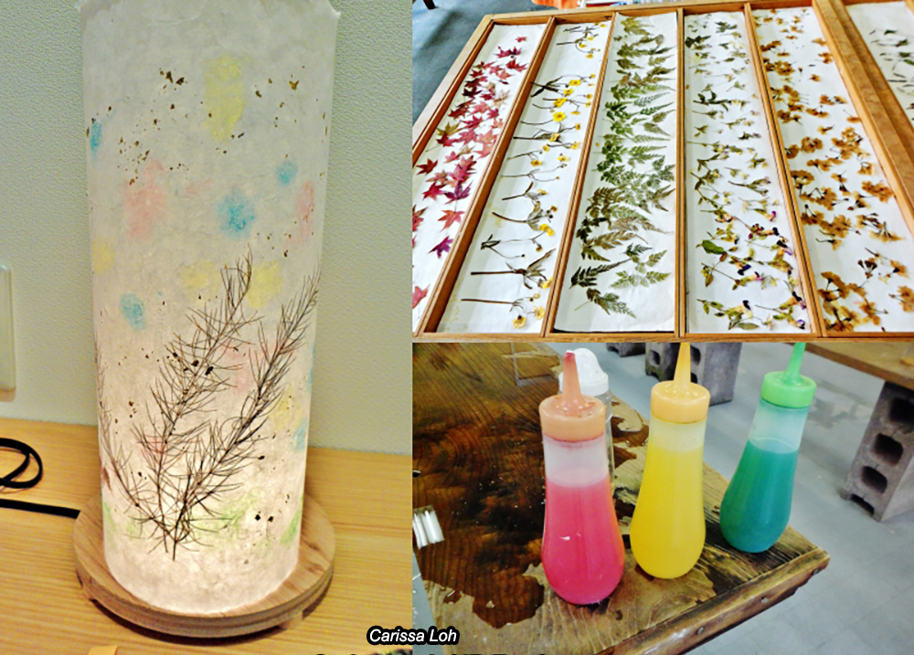 The whole process is pretty simple—you layer the pulp on the screen, add floral decorations, add more layers of pulp, add colouring and gold flecks, then wait for your creation to dry to dry. It's really fun. You can choose to make a variety of items, including envelopes, name cards, postcards, a lamp, an uchiwa fan and more. Just pick what you want to make, tell the staff, do it, then wait 10 minutes for it to dry. These items are small, so the staff sometimes use a vacuum machine to suck out the water from the screen, to reduce the drying time.