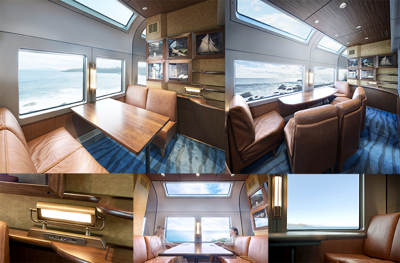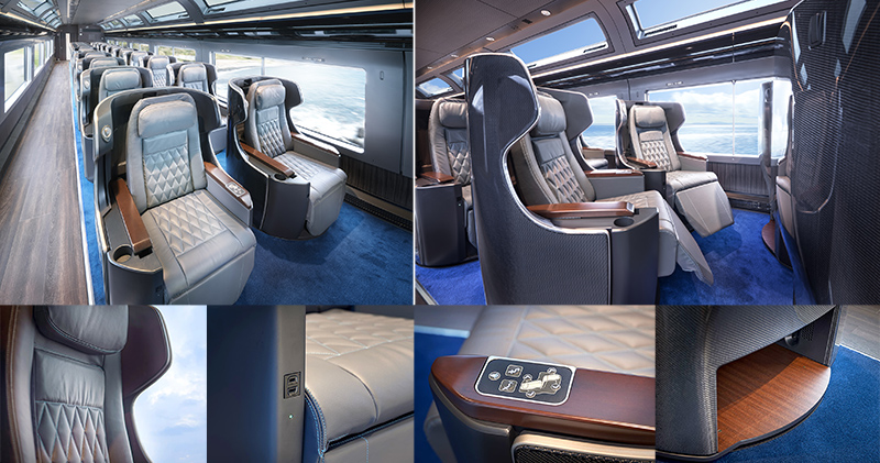 The car’s windows are large and wide, with added skylights for a more expansive view. For an even better view, the comfortable and plush leather seats can be swivelled towards the window.
