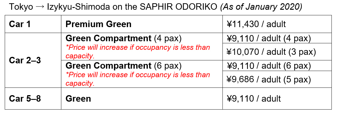 Below are the ticket prices for riding the SAPHIR ODORIKO from Tokyo to Izukyu-Shimoda. (Information correct as of January 2020.)