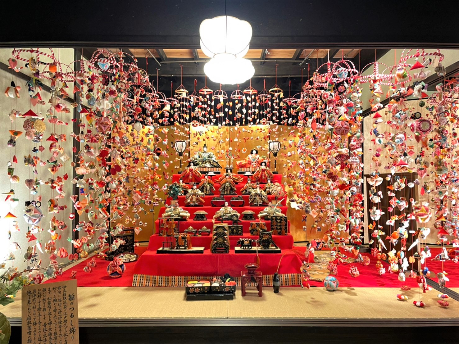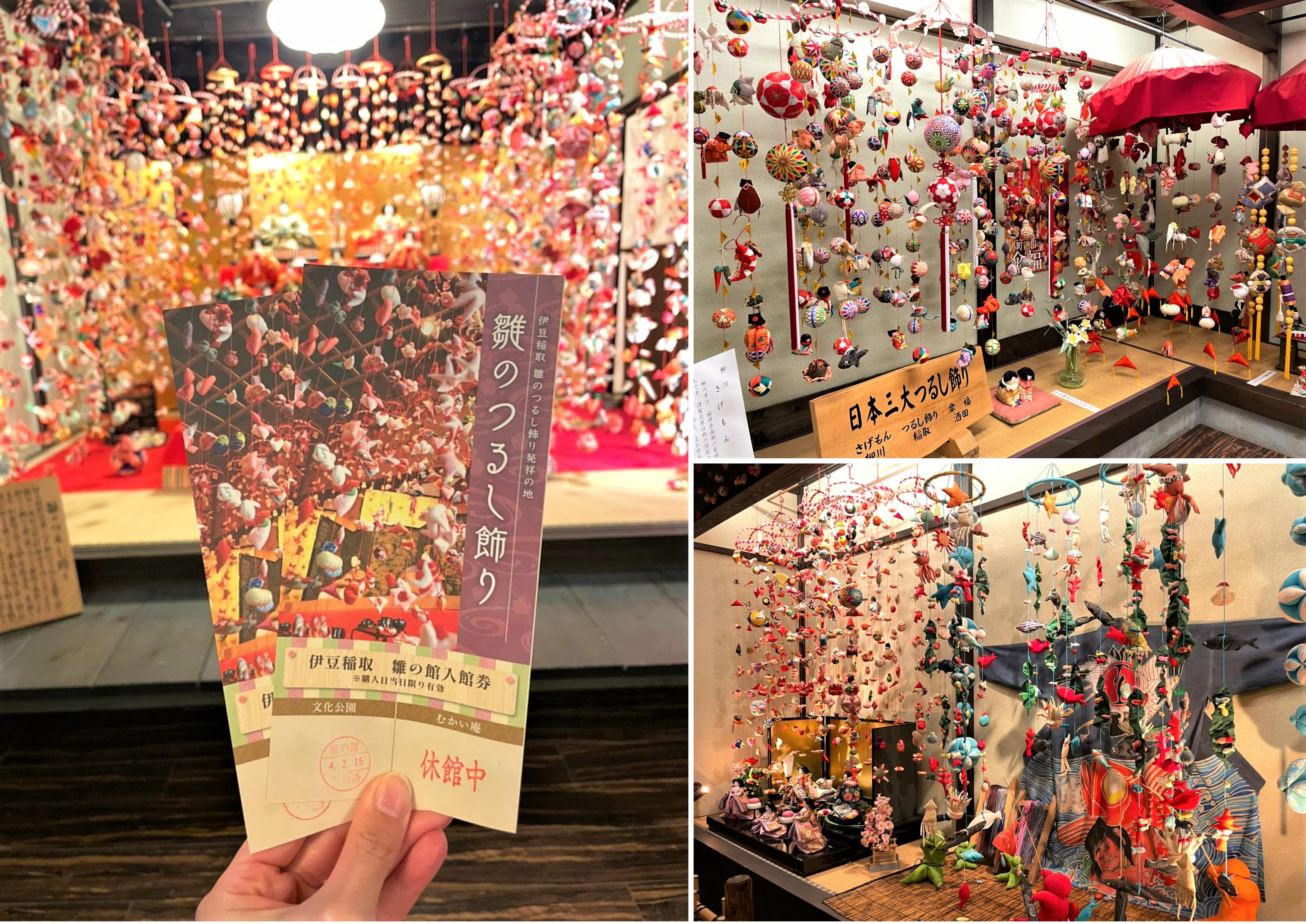 Inatori is known for its hot springs, but it is also home to the Inatori Tsurushibina Festival (稲取つるし雛まつり Inatori Tsurushibina matsuri), which showcases a unique tradition that has been around for more than 100 years. During this festival, intricate ornaments of various shapes are prepared and tied on strings to be hung, hence the name tsurushi (つるし hanging). The hanging ornaments are furnished alongside traditional hina dolls (雛人形 hina-ningyō), making for an eye-catching sight.