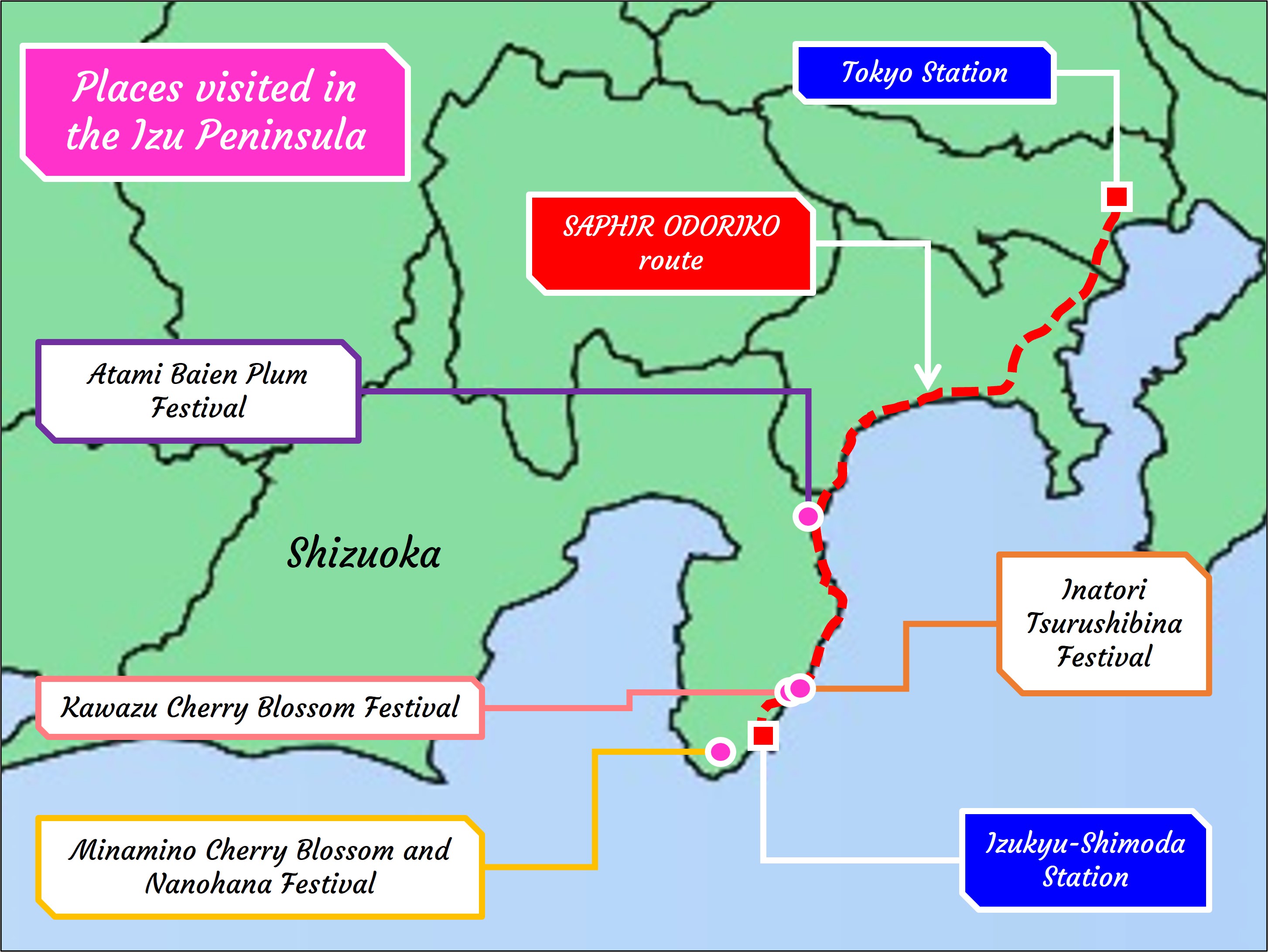 The Izu Peninsula (伊豆半島 Izu-hantō) is located in the eastern part of Shizuoka Prefecture (静岡県). The region is famous for its relatively untouched natural beauty, but do you know that flowers can be seen and enjoyed here even in the month of February?