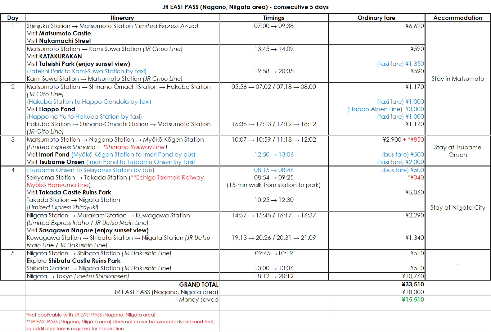 Just like my trip around Tohoku, the best kind of trip around Shinetsu is one that includes everything: nature, sightseeing, hot springs, famous attractions, and travelling to such places by train. JR EAST PASS (Nagano, Niigata area) enables me to do all the above, and with unlimited rides on JR trains in the region for 5 consecutive days, I can stand to save a lot of money on train fares.