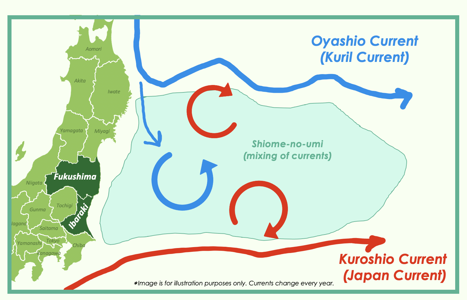 Facing the Pacific Ocean, the coastal areas of Fukushima (and Ibaraki) are blessed by being places where the the warm Kuroshio current (黒潮) mixes with the cold Oyashio current (親潮). Known as Shiome-no-umi (潮目の海 place where currents meet), the waters in these areas have plenty of plankton—the major food source for most fish—which creates good conditions for marine life to thrive. Highly prized for their quality, freshness, and tastiness, the seafood caught off the coast of Iwaki is known as Joban-mono (常磐もの Jо̄ban mono).