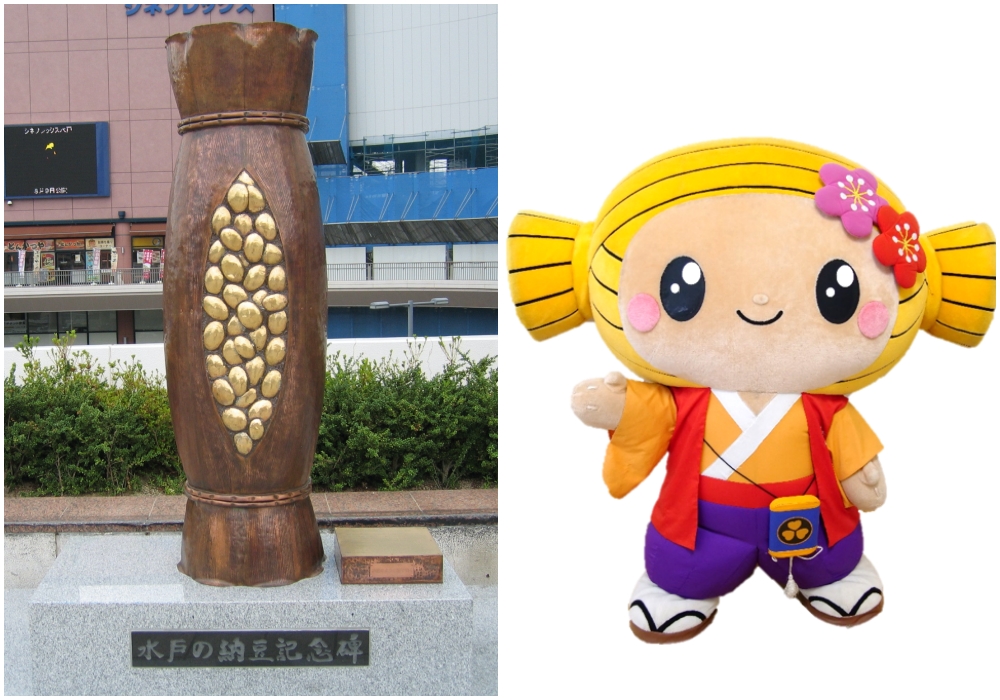 Natto statue outside JR Mito Station, and Mitochan, who wears a wara-natto hat. (Image credit: 水戸市観光課)