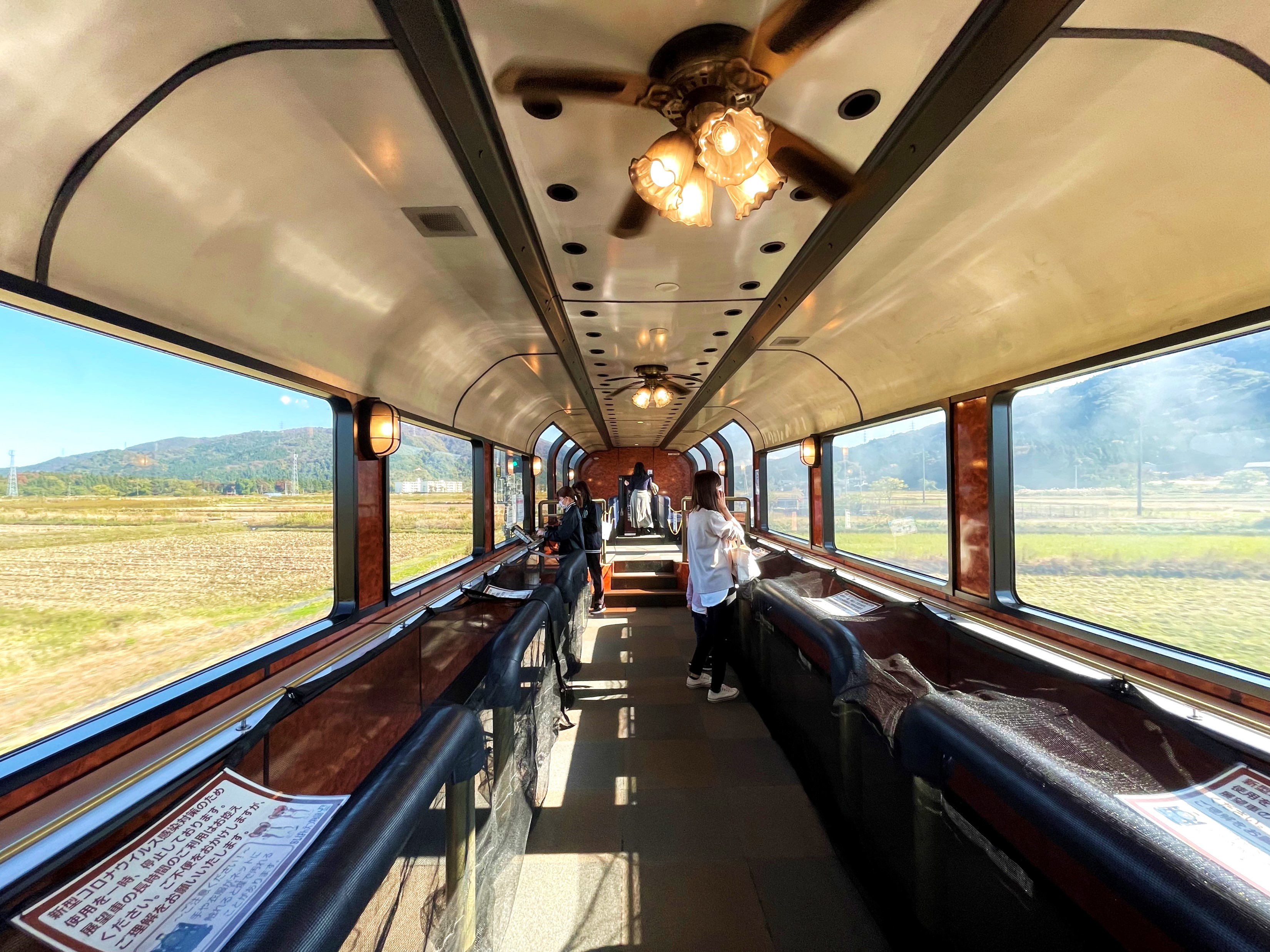One outstanding characteristic of the SL Banetsu Monogatari is its high seating capacity: up to 346 passengers can ride the train! As such, the train has a total of four ordinary passenger cars: Cars 2, 3, 5, and 6. When Jak and Emmie walked through the cars, they felt like they had gone back in time because of the retro fittings and vintage interior designs that pay homage to railway travel during the Taishō Era (1912–1926), a time when SL trains were prevalent. All the seats are boxed seats, so groups (especially families) can enjoy their time on the train while seated together.