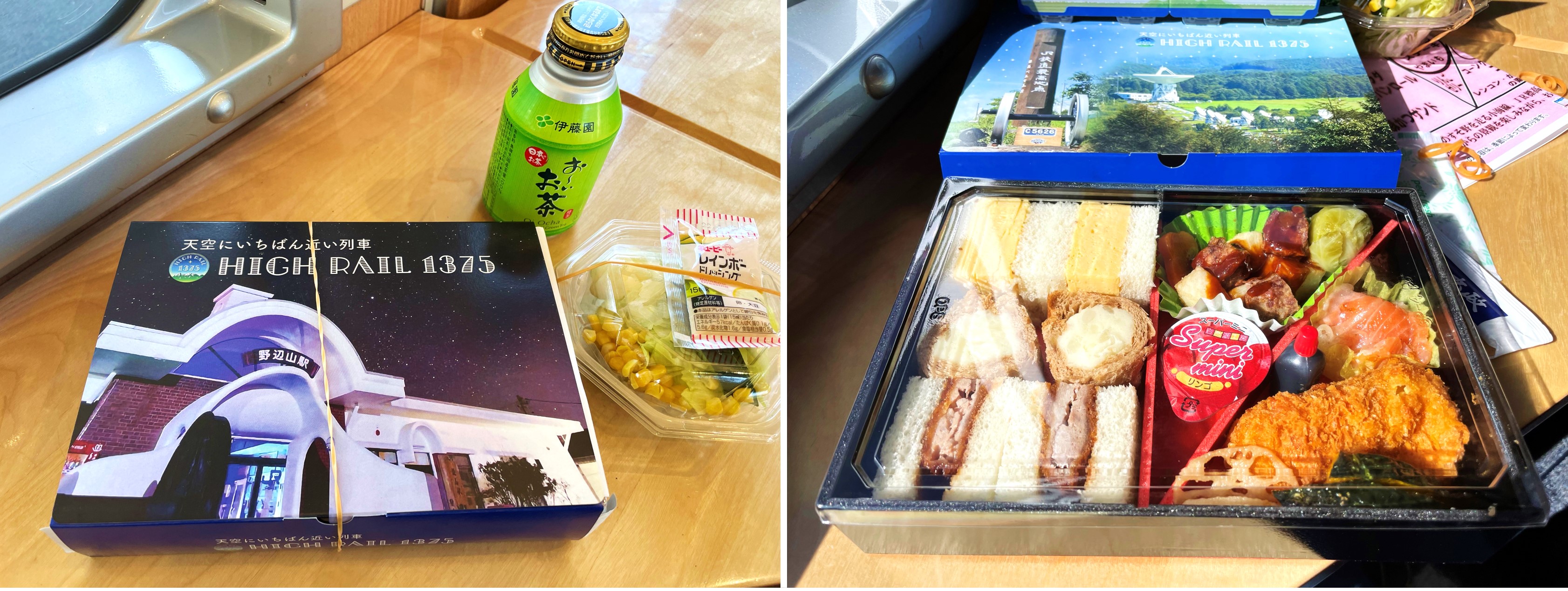Of course, like their trip on the KAIRI and Koshino Shu*Kura, a ride on a Joyful Train wouldn’t be complete without delicious food. For their ride on the HIGH RAIL 1375, they bought a brunch set as part of the train's "Meal Options", and it consisted of delectable tonkatsu and egg sandwiches. But what caught Jak and Emmie’s attention in particular was the packaging: the front cover featured a beautiful image of JR Nobeyama Station (JR野辺山駅 Nobeyama-eki), the JR station with the highest elevation in Japan, amidst a starry night sky.