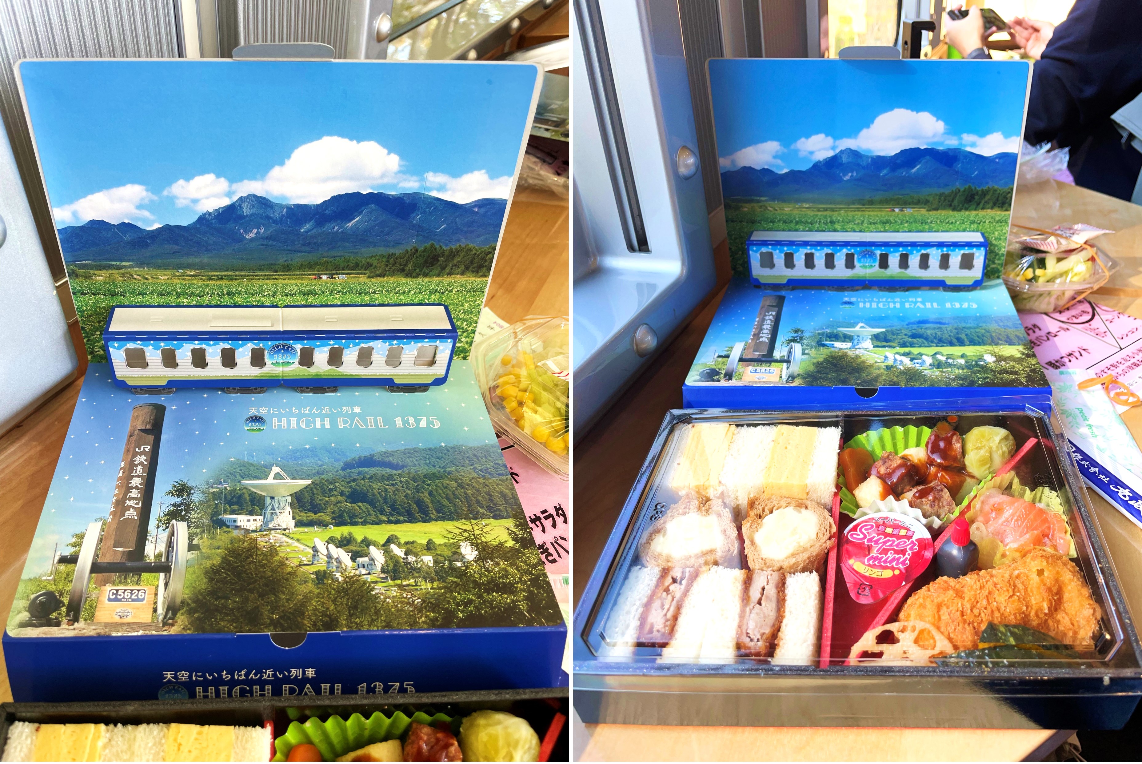 Another surprise awaited Jak and Emmie as they opened up their brunch boxes. Inside the box was a cut-out of the HIGH RAIL 1375, the exact train that they were riding! The cut-out also featured mesmerising images of the Yatsugatake Mountains, the Nobeyama Radio Observatory, and the monument for the highest elevation of JR railway tracks. They were signs of what was to come for the duo, so the excitement was palpable for them just by looking at the images.