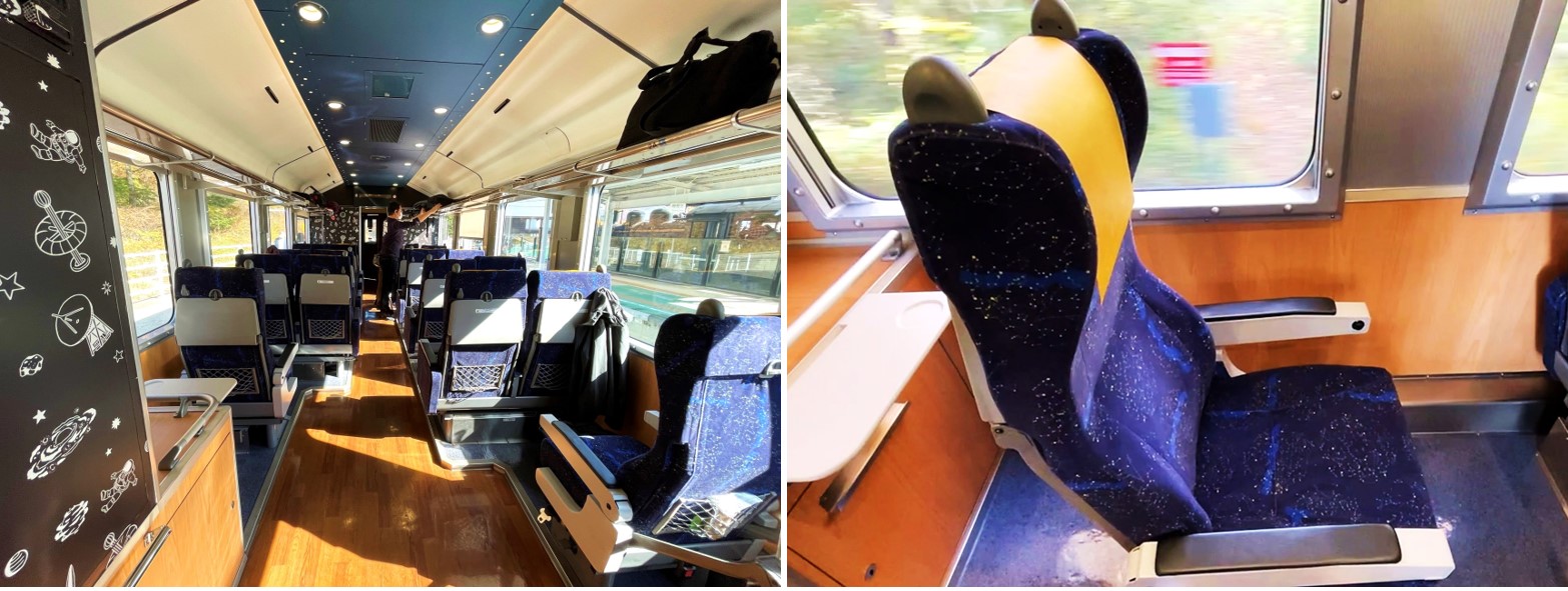 Seats in Car 1, including boxed seats (left) and single seats (top right). (Image credit: Japanmase)