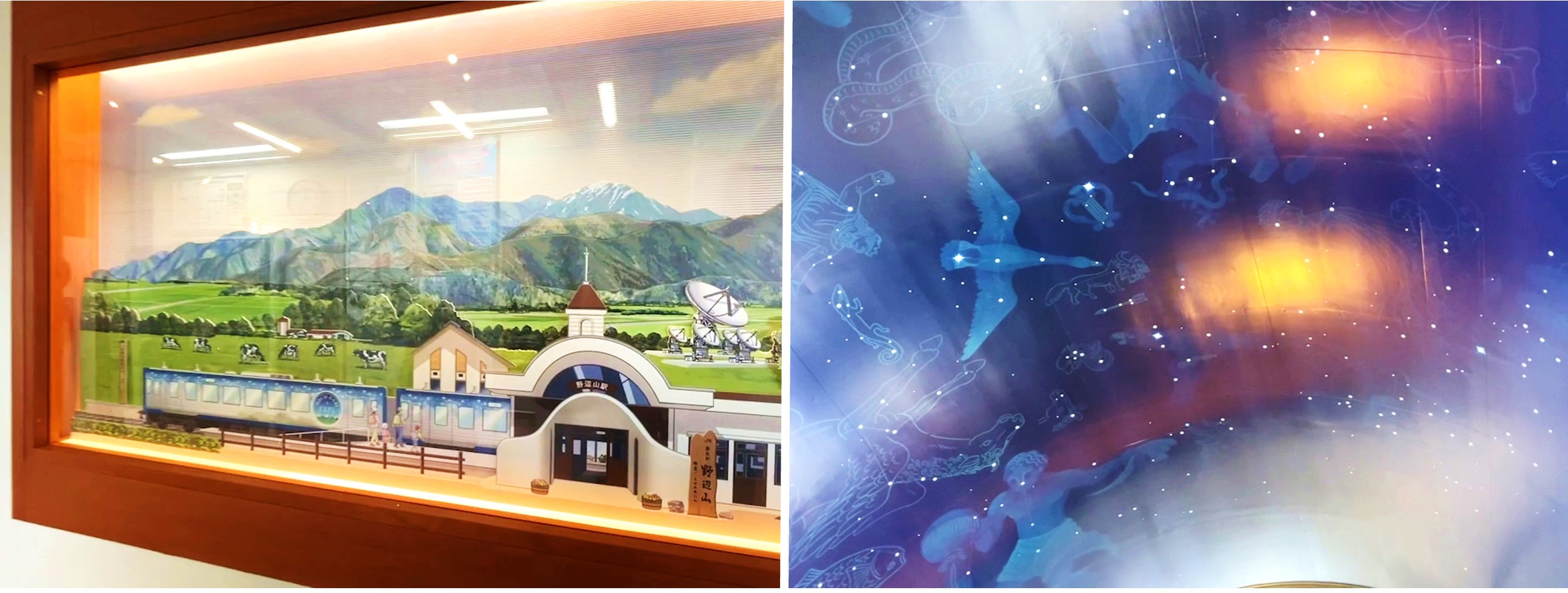 An artwork of JR Nobeyama Station (left) and the roof depicting the different constellations (right). (Image credit: Japanmase)