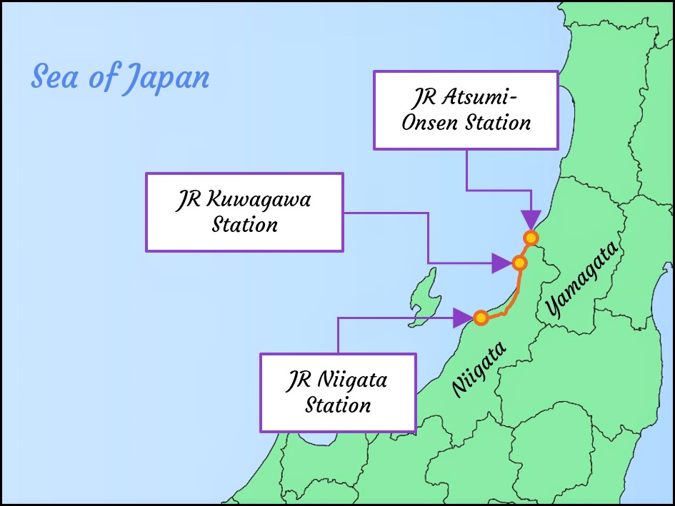 The KAIRI travels between JR Niigata Station and JR Sakata Station (JR酒田駅 Sakata-eki), but for their journey, their destination was JR Atsumi-Onsen Station (JRあつみ温泉駅 Atsumi-Onsen-eki) instead. The train is made up of four cars in total, each with their own unique characteristics.
