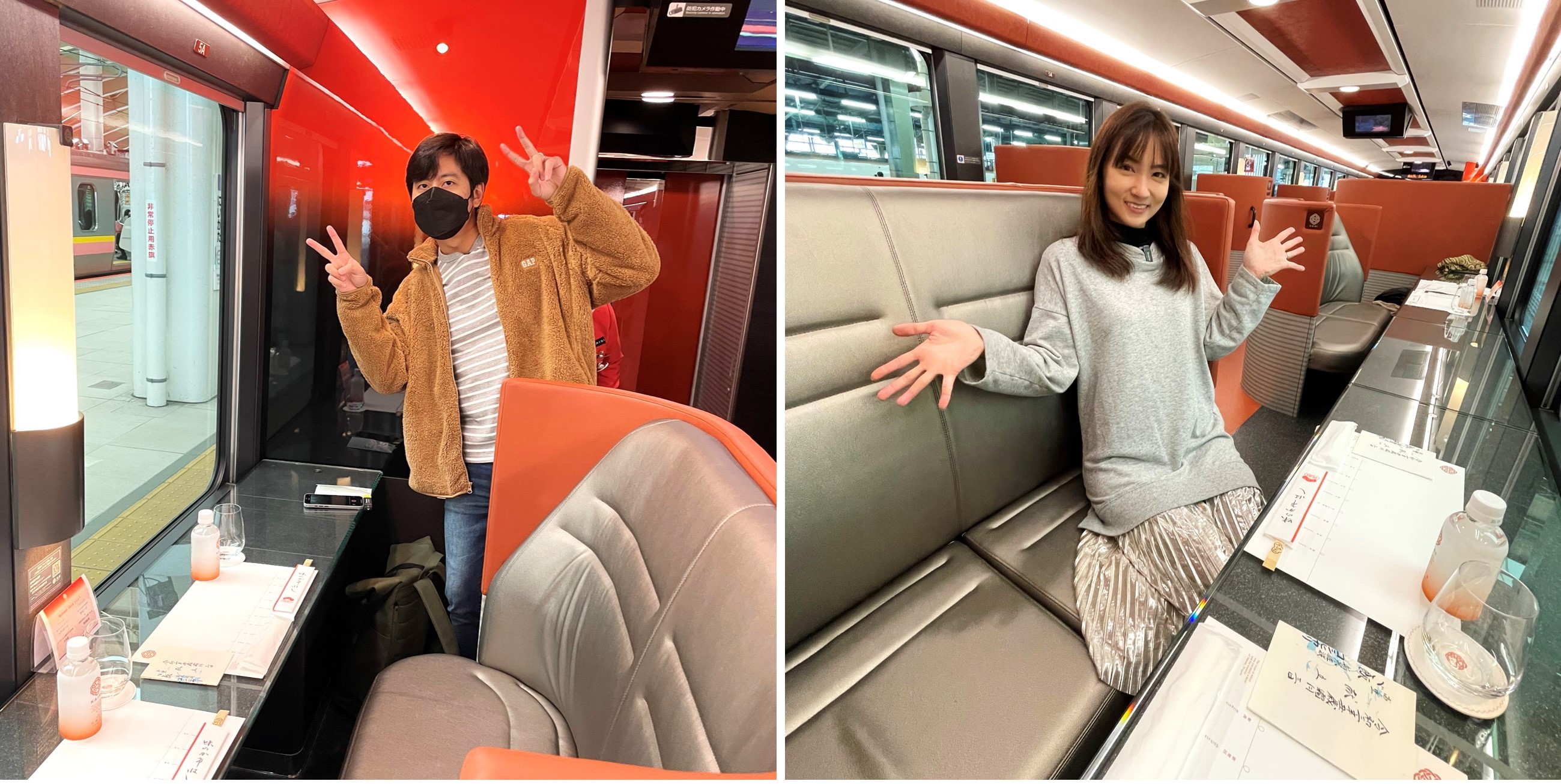 Car 4 is the dining car, and here passengers can relish the best cuisine that Niigata and the Shōnai Region, which is also one of the main highlights of the KAIRI. There are 24 seats here altogether: four 2-person boxed seats, two 2-person window seats, and three 4-person boxed seats. Jak and Emmie went with the window seat because they wanted to enjoy their meals while directly facing the window. Of course, they couldn't contain their excitement at how comfy the seats were.