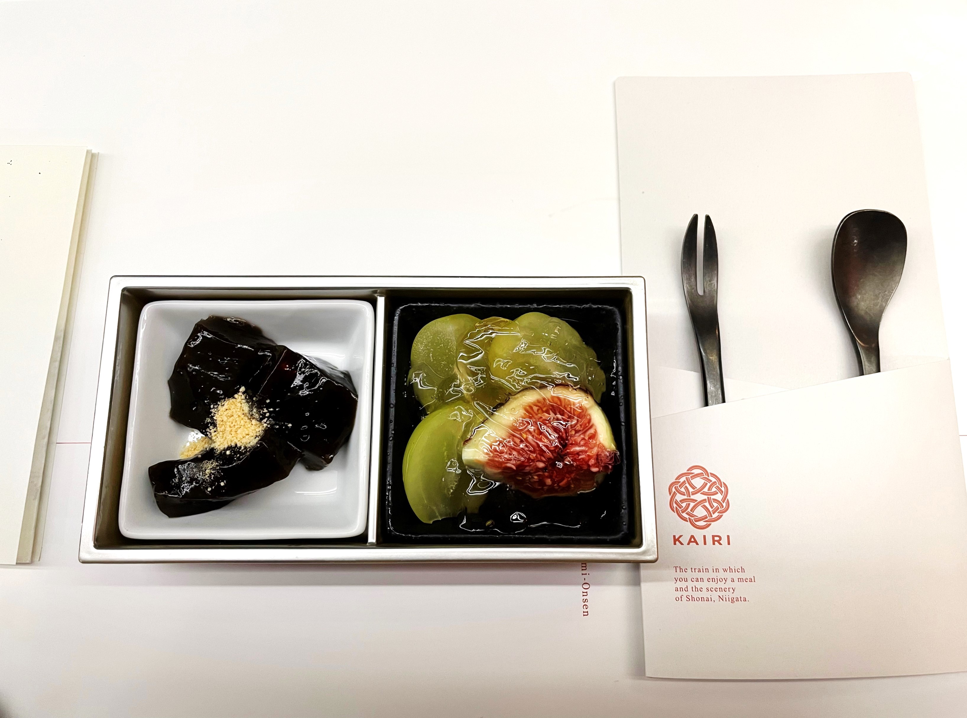 If you think Jak and Emmie were done with desserts, you’d be wrong. When they hopped back onto the KAIRI and resumed their journey, they were greeted with another serving of desserts, which came together with the travel package that included the meal earlier on. It featured warabi-mochi (わらび餅) with soya bean flour, Shine Muscat grapes, and figs in apricot jelly. Needless to say, it was extremely delicious and tasted as wonderful as it looked.