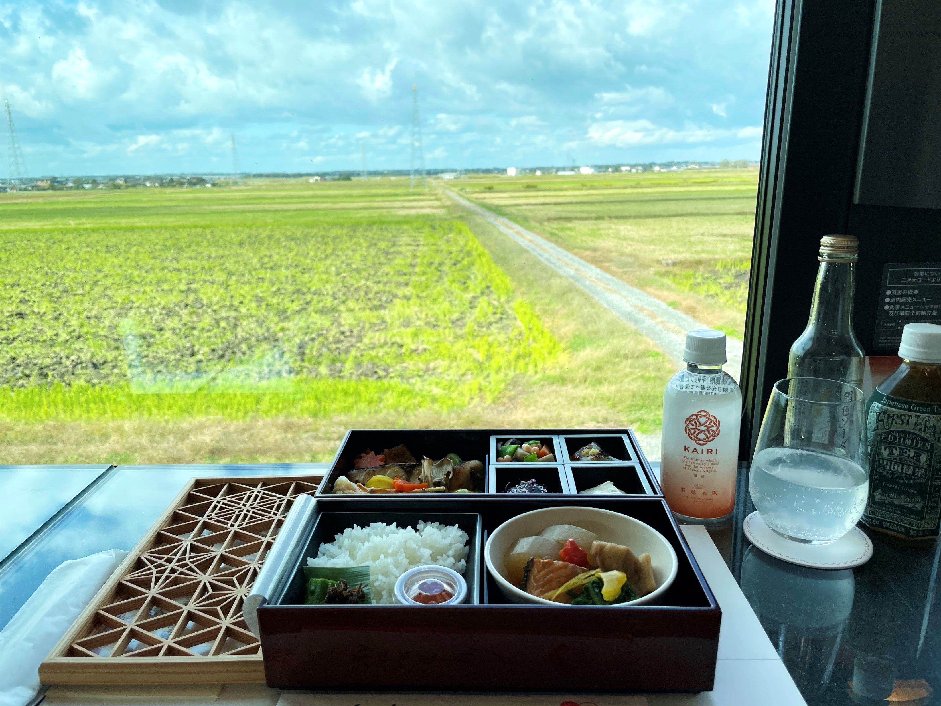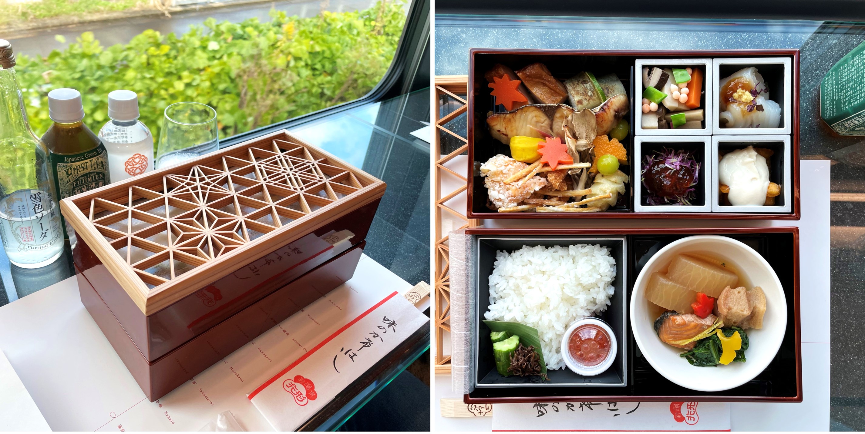 Jak and Emmie were amazed at the sheer hospitality of the train staff, who attended to all their needs and requests. The staff introduced the meals that was included with the travel package, but before that, Jak and Emmie were asked to select their welcome drinks. They went with the local soda and green tea set, but the drinks aren’t your regular soda and green tea. The green tea was named Yukiguni Green Tea (雪国緑茶 yukiguni ryokucha), in reference to regions such as Niigata and Yamagata for their high snowfall levels for extended periods of time.